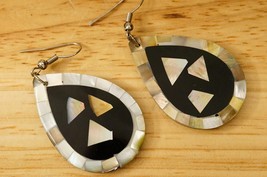 Costume Jewelry MOP Mother of Pearl Shell Inlay Teardop Dangle Pieced Earrings. The earring body measures 1-5/8" long. Gently preowned. No smoke or pet odor.