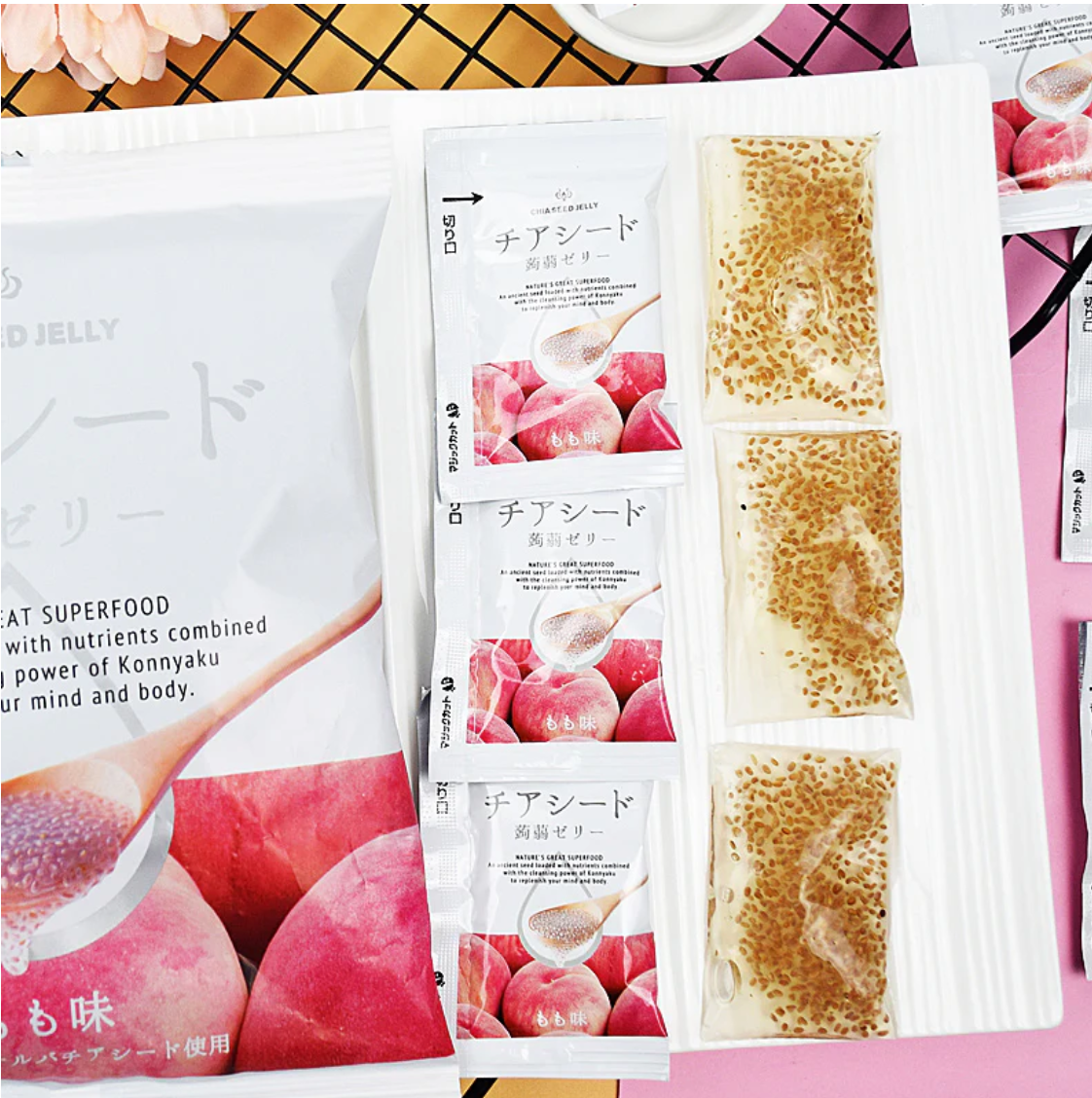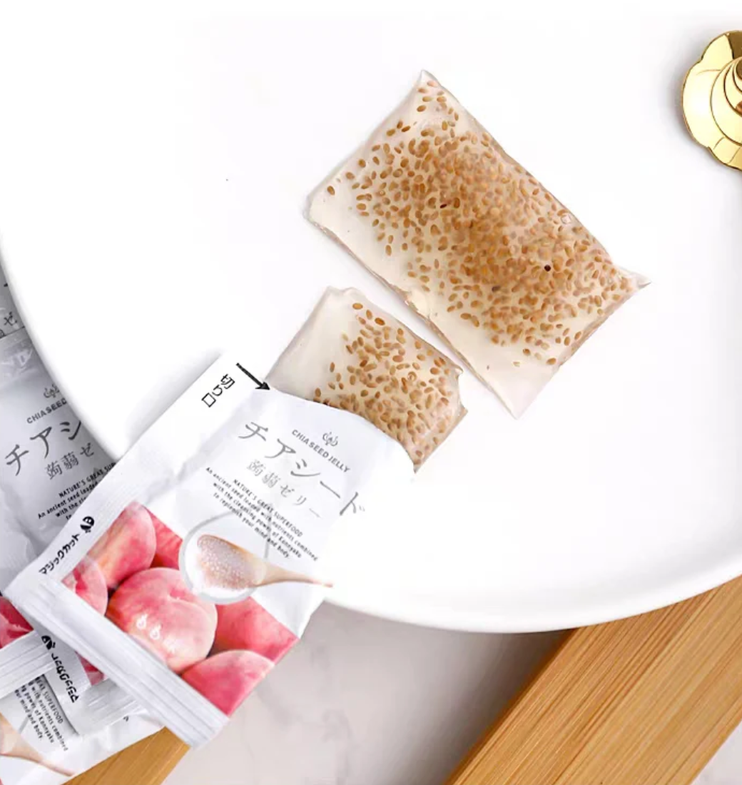 Introducing a natural superfood: chia-seeded konjac jelly with peach flavor. This ancient seed is packed with nutrients and combined with the cleansing power of Konjac to replenish your mind and body. This vegan sweet is sweetened with beet sugar and made with all plant-based ingredients. Experience the lusciousness of ripe peaches infused into every spoonful of chia seed jelly, offering a juicy and satisfying treat that embodies the essence of summer.