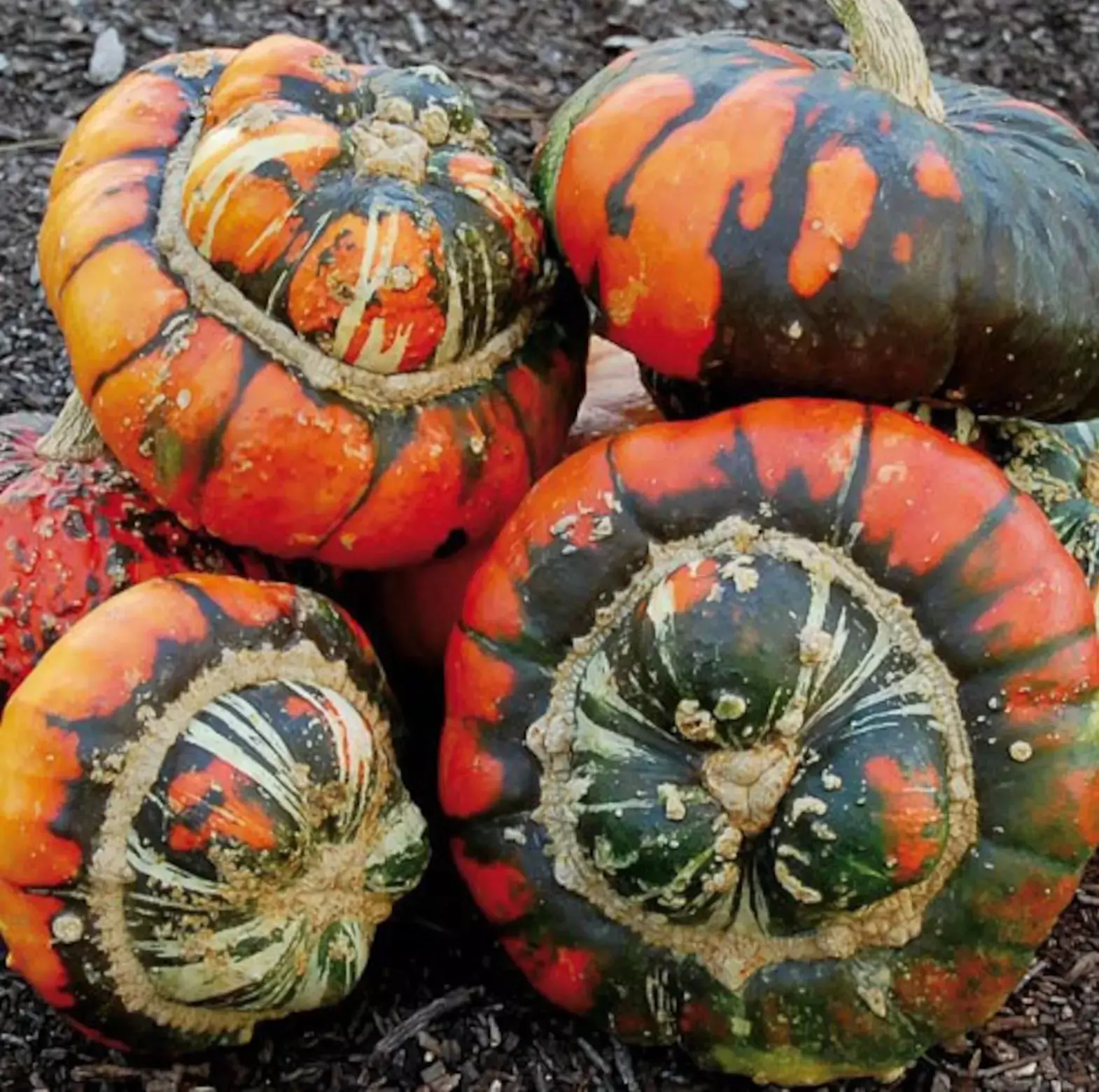 Turks Turban. Brightly colored ornamental squash has large, flattened fruits. This gourd is striped with scarlet, white, orange, cream, and green. It is decorative and edible. Turk's Turban Gourd seeds yield orange gourds that have a flavor similar to squash.