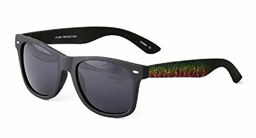 Black Square Rasta Marijuana Weed Leaf Print Sunglasses are an inexpensive alternative to high end name brand designer shades. Design features a Jamaican / Rasta inspired green, yellow and red weed leaf print on each arm/leg and a black sporty plastic frame with black lenses in your choice of available colors. These glasses are fashionable, sophisticated, sleek perfect for any occasion.
