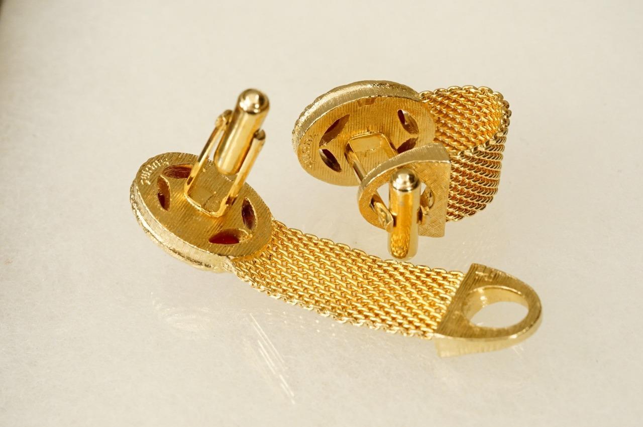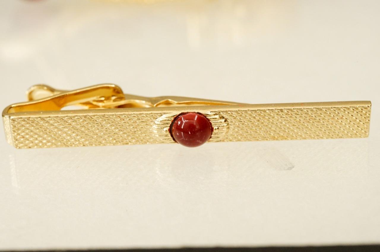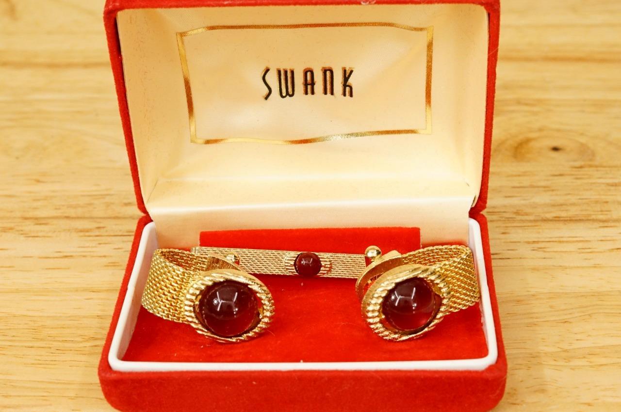 Vintage Mens Jewelry Raspberry Pink Lucite Moonglow SWANK Cuff Links Set - gold tone base metal with matching tie clasp. Excellent condition in the original sales box. No smoke or pet odor. Swank.