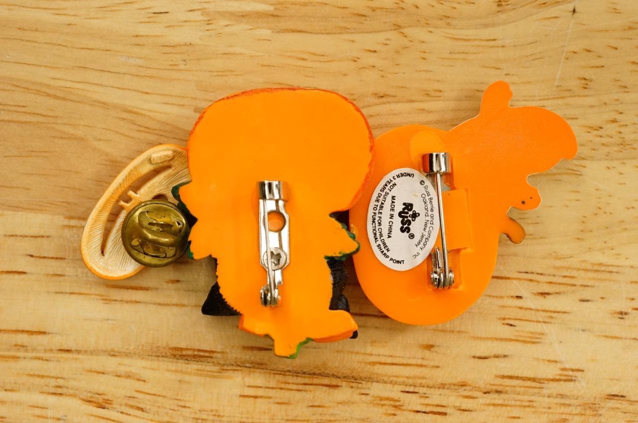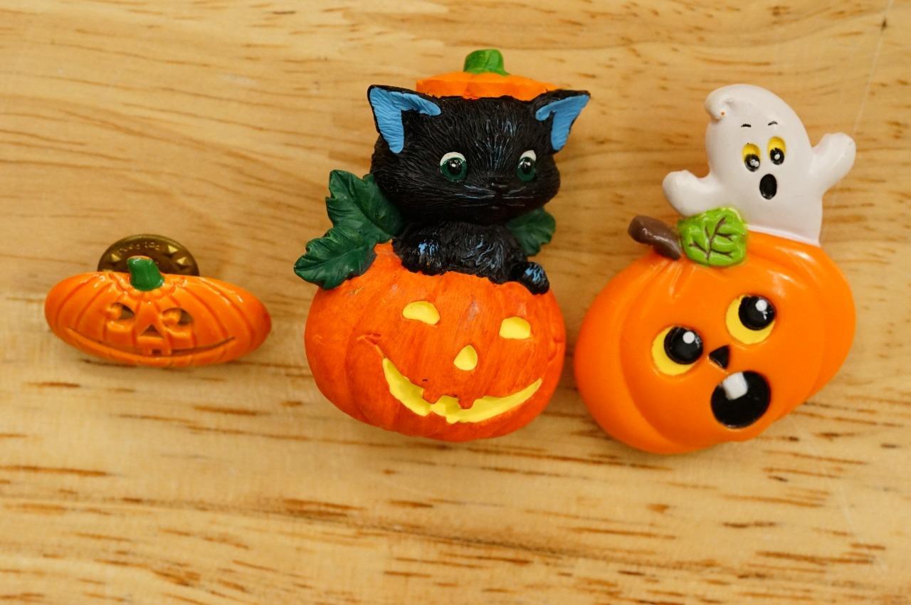 Vintage Costume Jewelry HALLOWEEN Lot Plastic Metal Pumpkins Ghost Brooch Pins - the larger pin measures 1.75" as a size reference.