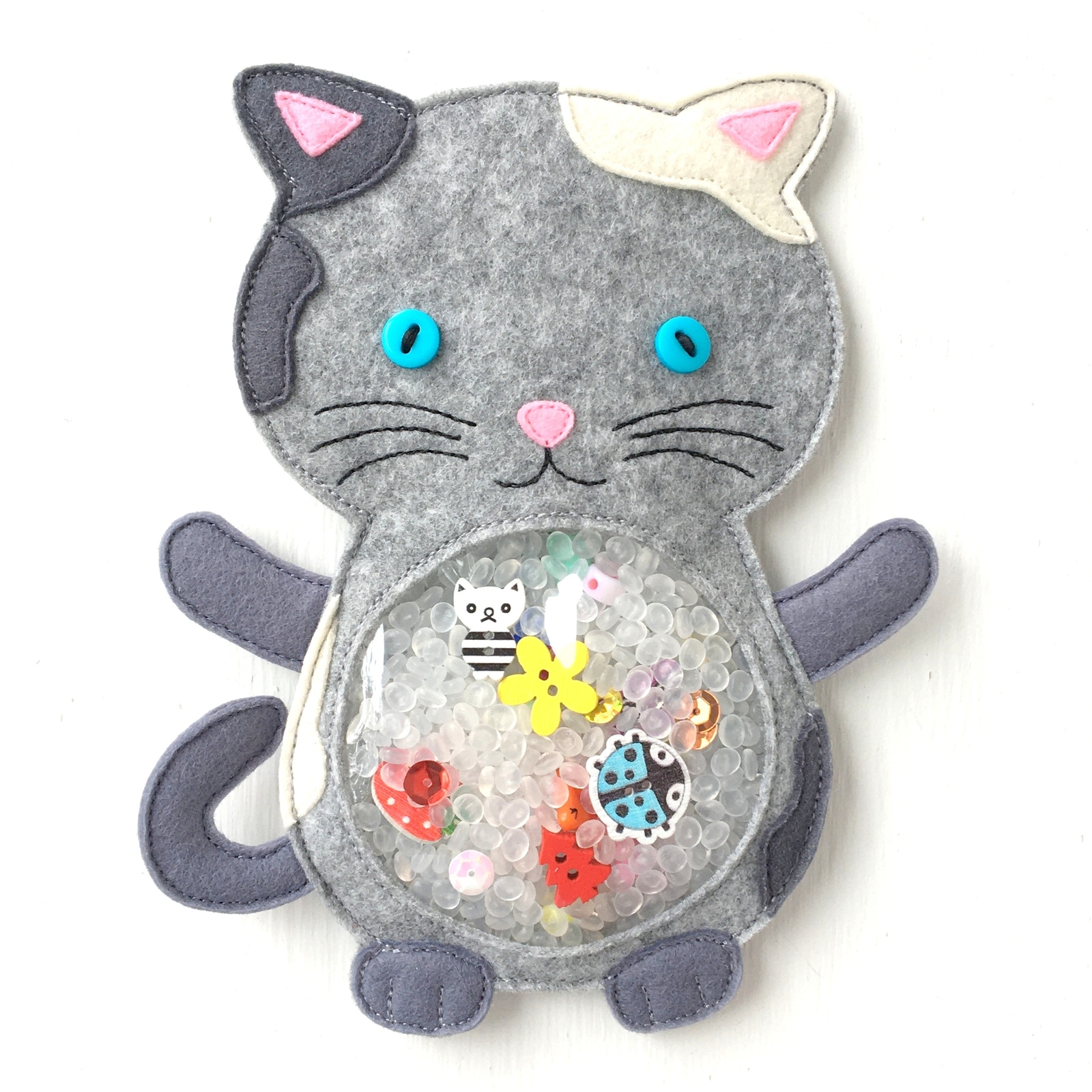 I spy bag stitched from Korean hypoallergenic felt.?The window is made of transparent and durable PVC film.?The filler is plastic granules, beads and decorative buttons.