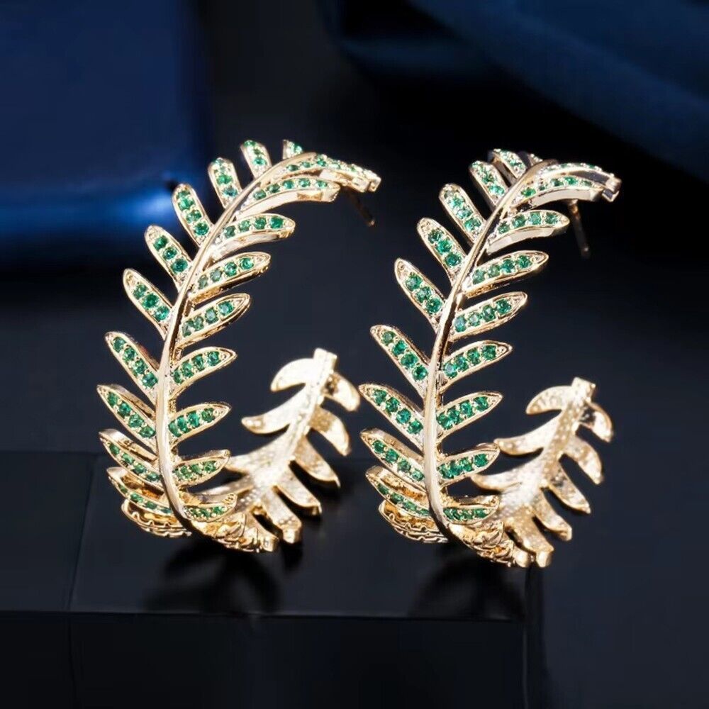 Hot Sale Lab Created Emerald & Diamond 14K Yellow Gold Plated Leaf Bent Earrings