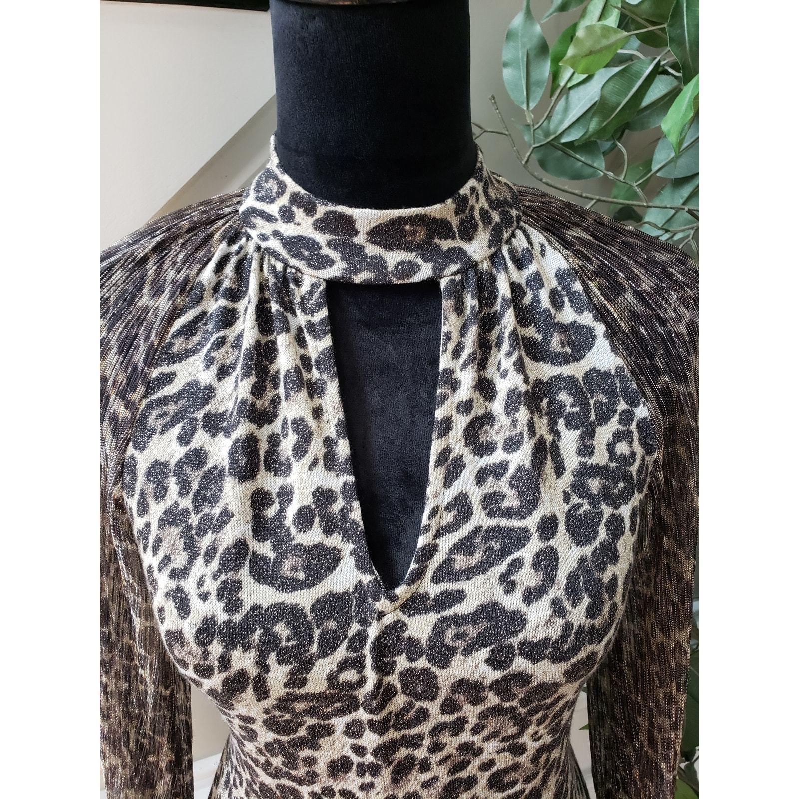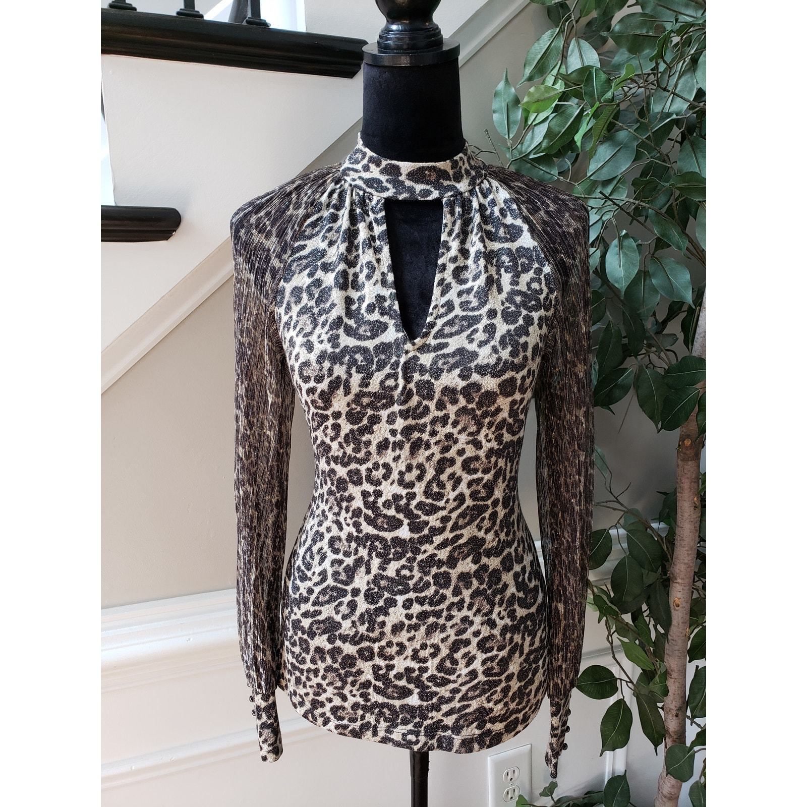 Fever Top Blouse XS Leopard Print Black & Beige Casual Mesh Sleeve Halter Neck