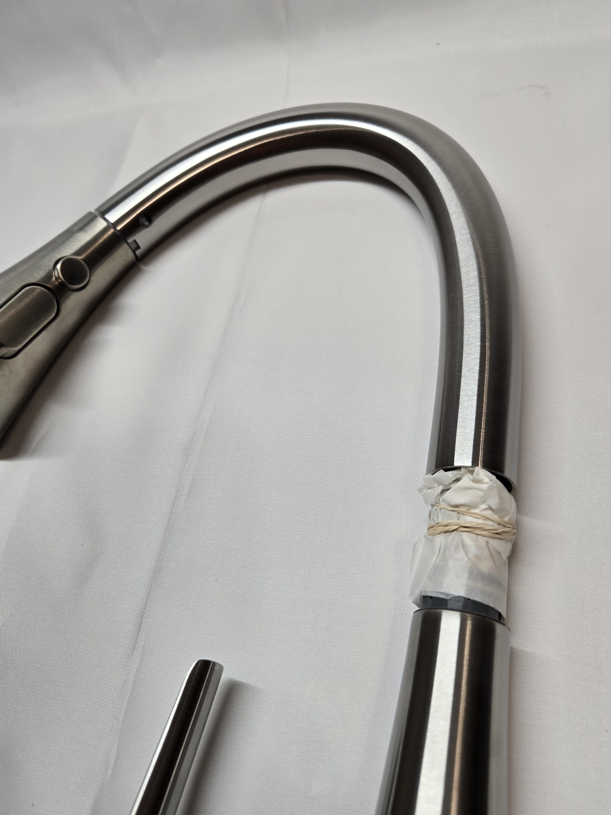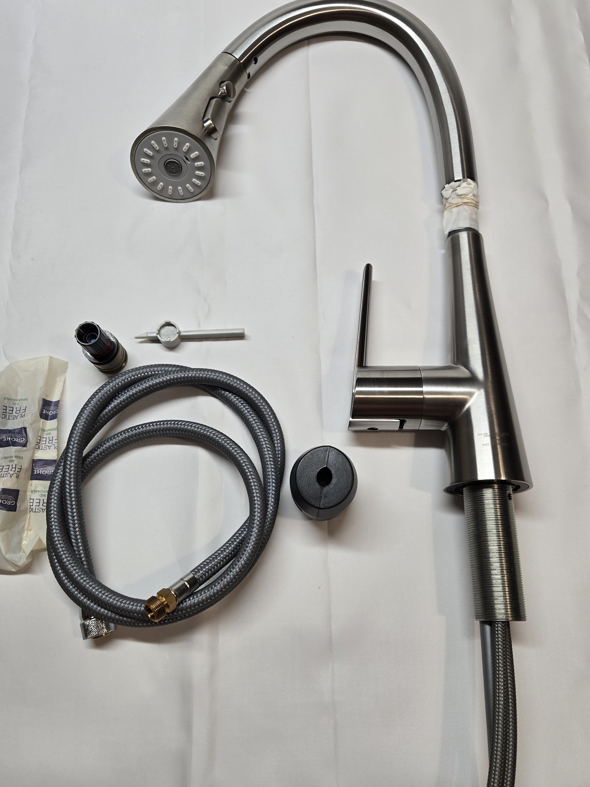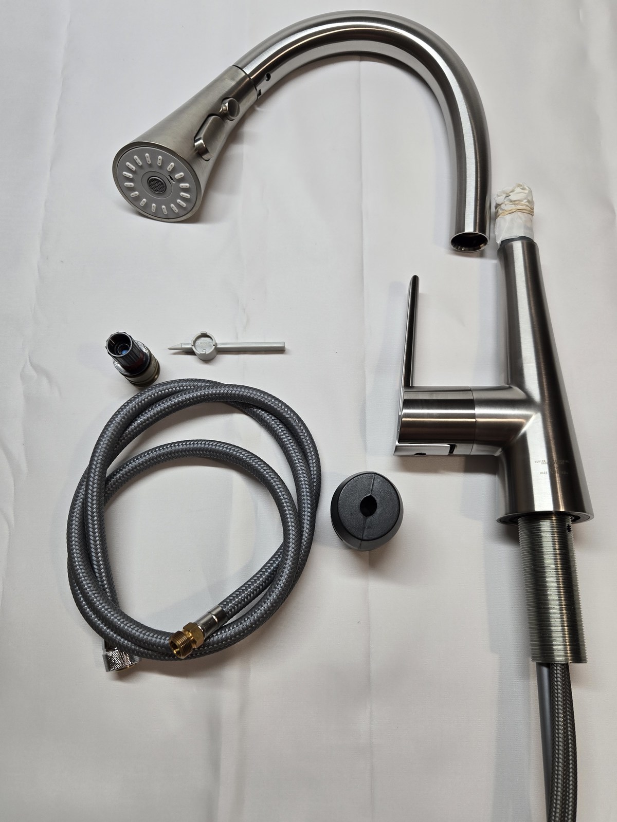 PULL-DOWN KITCHEN FAUCET: Features triple-function spray head with regular stream, spray, powerful blade spray, plus pause to briefly stop water flow