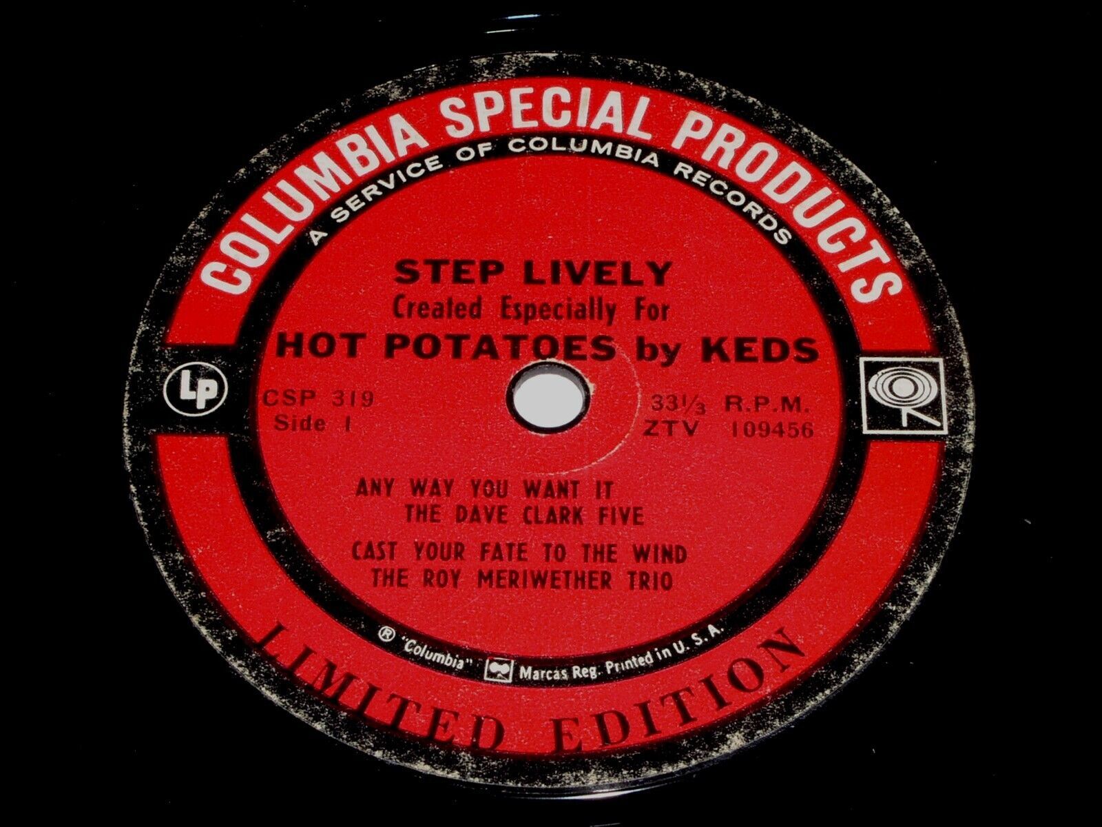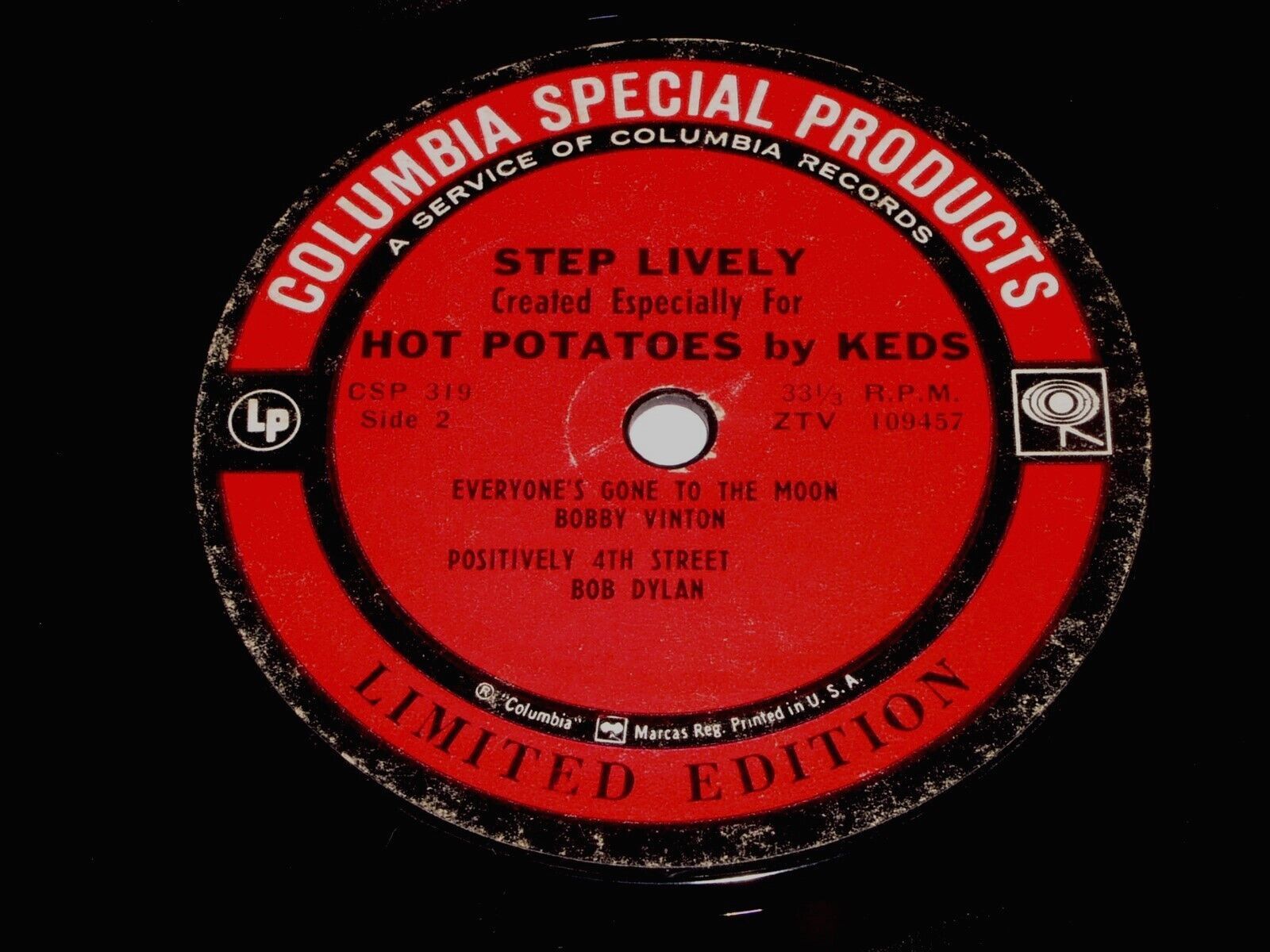 This is a vintage 33 1/3 rpm phonograph record entitled, "Columbia Special Products Step Lively Created Especially For Hot Potatoes by Keds". Songs: Bobby Vinton Everybody's Gone To The Moon, Bob Dylan Positively 4th Street, The Dave Clark Five AnyWay You Want It, The Roy Meriwether Trio Cast Your Fate To The Wind. Record label: Columbia CSP 319.