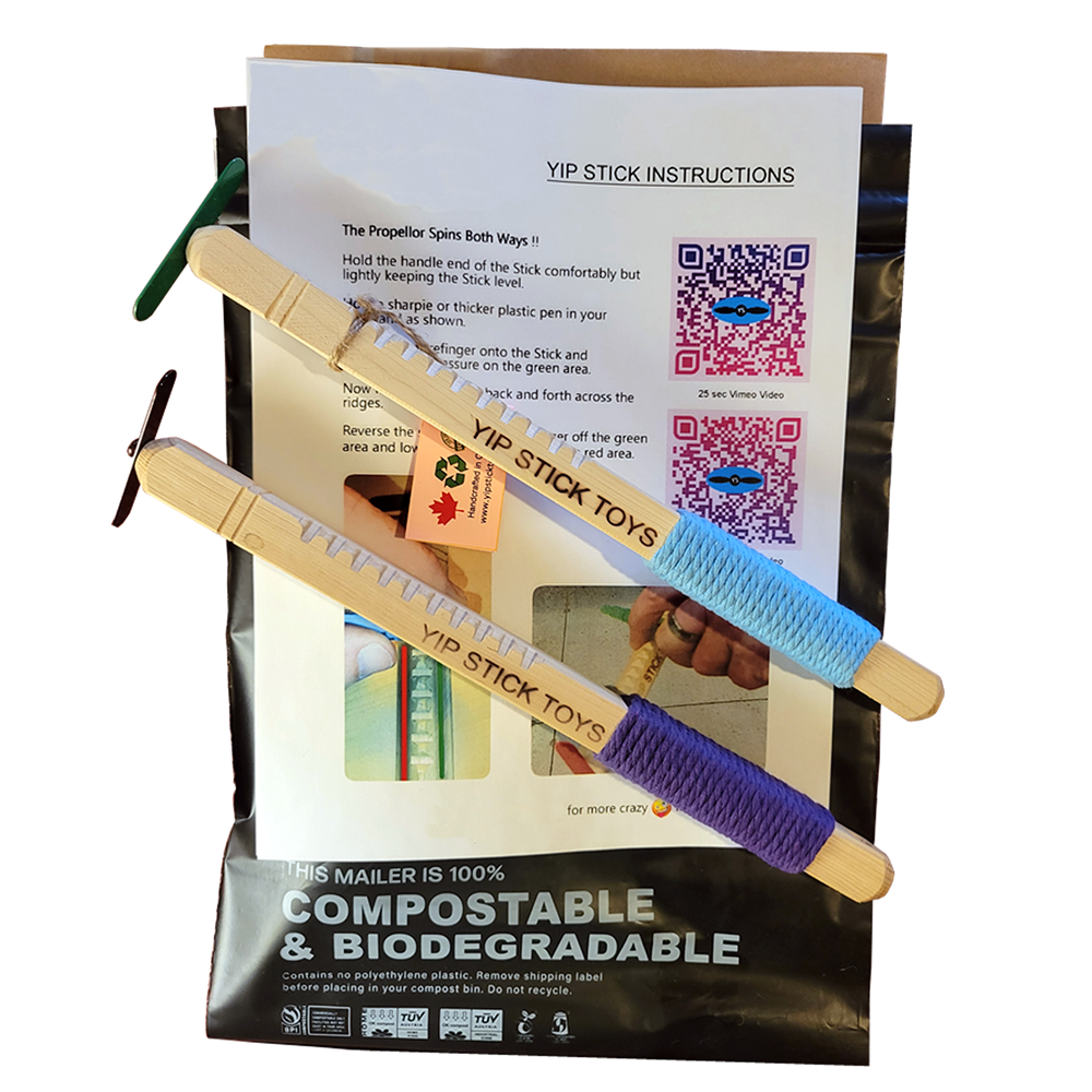 Yip Sticks Toys are the coolest spinners. Finger magic makes the propeller spin in either direction. Master the magic in minutes. Amaze family and friends by reversing the spin when they say your magic word. Made with cedar and cotton. This spinner has a good feel, a natural look and is perfect for ages 8 to 88. Crafted in Canada and made to last. The perfect birthday gift and Christmas gift and interactive fun toy. 99% bio-degradable and ships in a compostable mailer.
