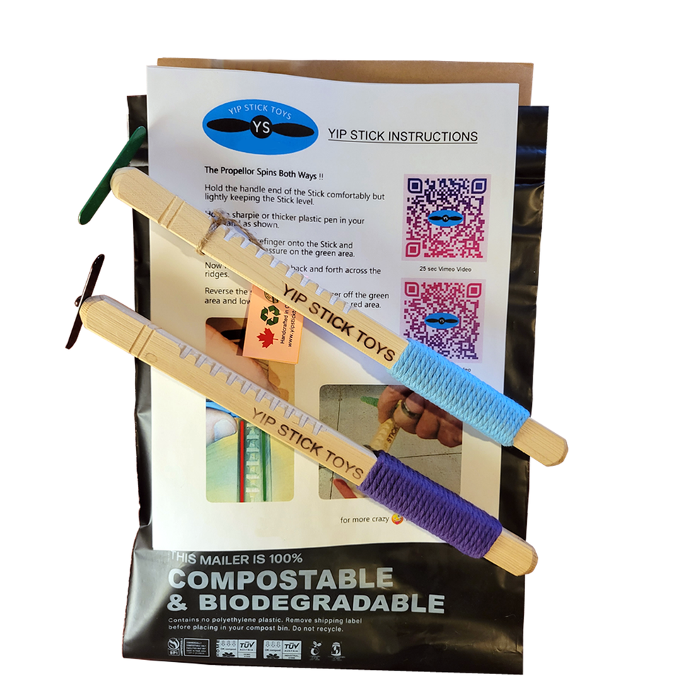 Yip Sticks Toys are the coolest spinners. Finger magic makes the propeller spin in either direction. Master the magic in minutes. Amaze family and friends by reversing the spin when they say your magic word. Made with cedar and cotton. This spinner has a good feel, a natural look and is perfect for ages 8 to 88. Crafted in Canada and made to last. The perfect birthday and Christmas gift and interactive fun toy. 99% bio-degradable and ships in a compostable mailer.