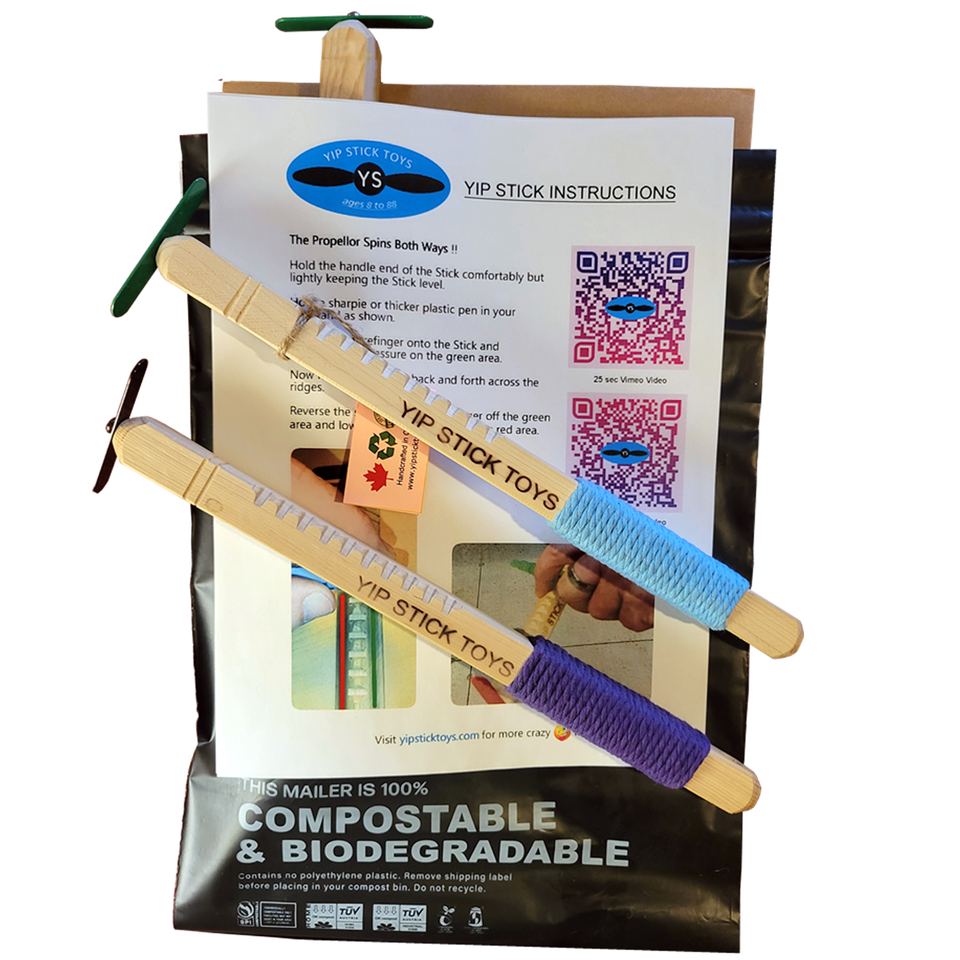 Yip Sticks Toys are the coolest spinners. Finger magic makes the propeller spin in either direction. Master the magic in minutes. Amaze family and friends by reversing the spin when they say your magic word. Made with cedar and cotton. This spinner has a good feel, a natural look and is perfect for ages 8 to 88. Crafted in Canada and made to last. The perfect birthday and Christmas gift and interactive fun toy. 99% bio-degradable and ships in a compostable mailer.