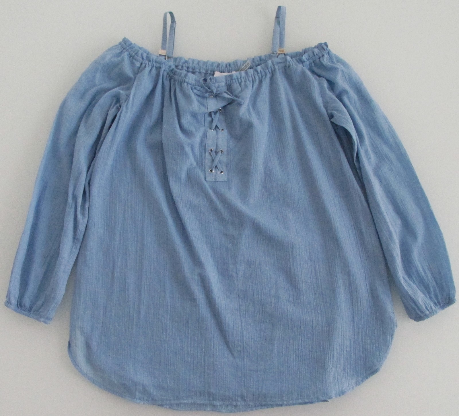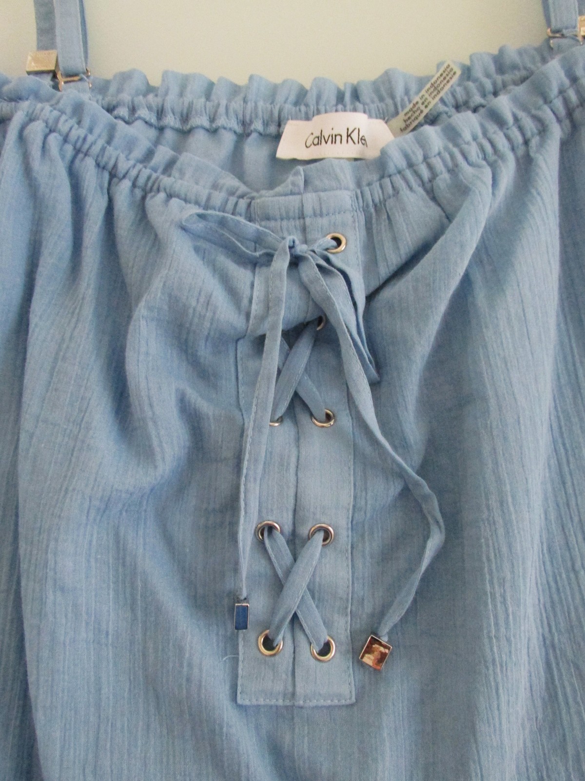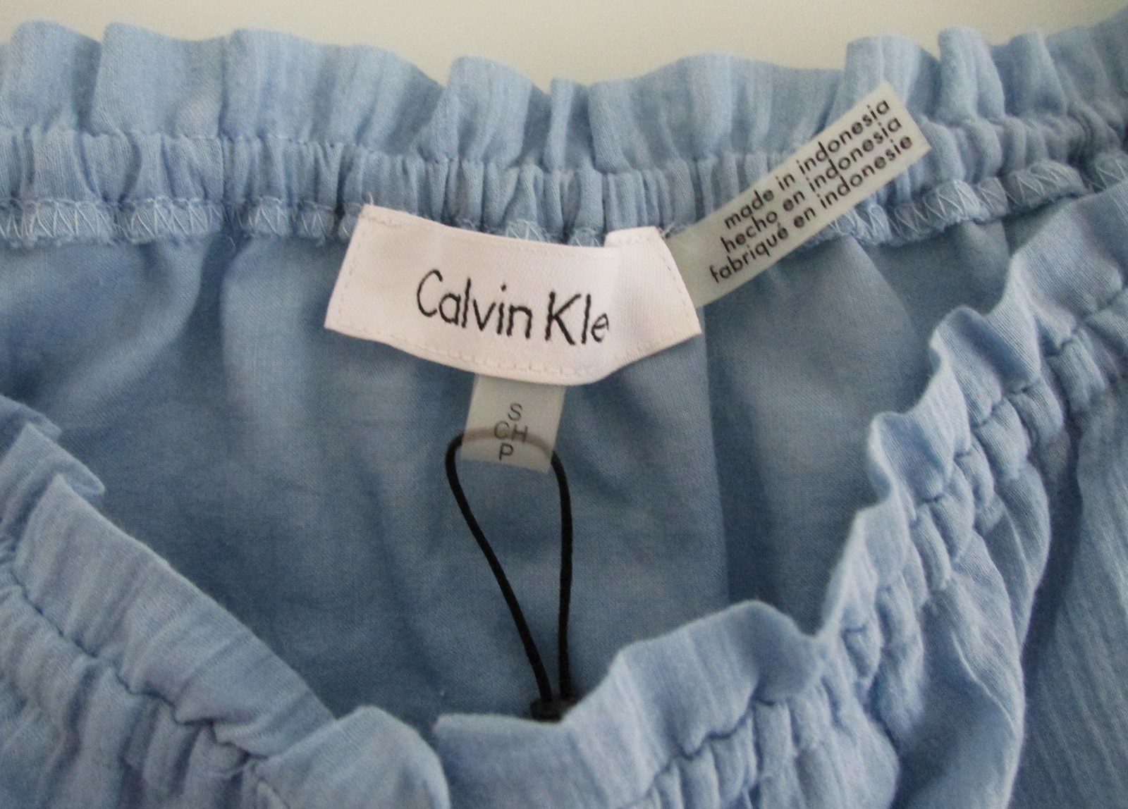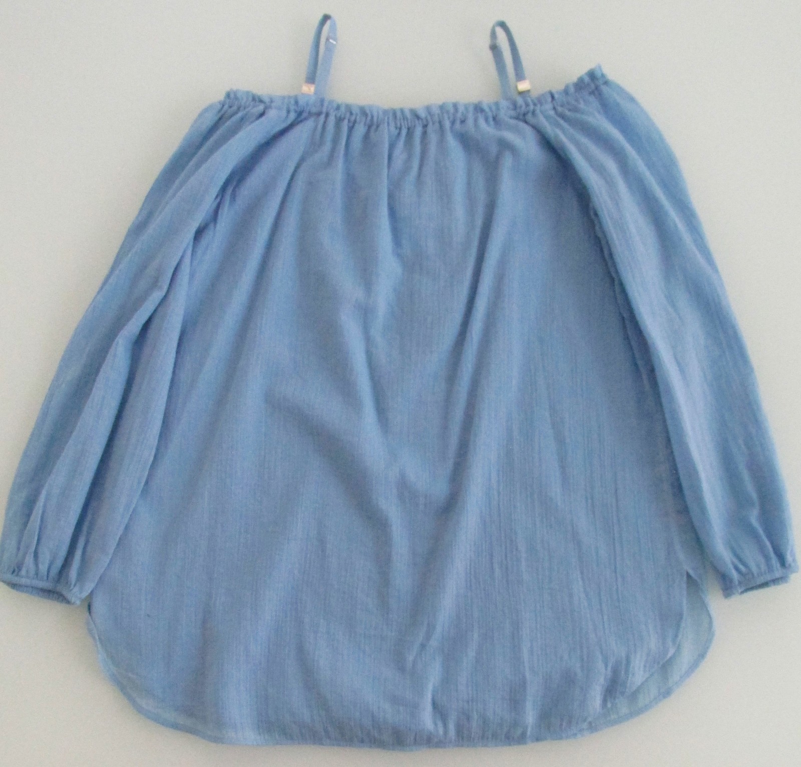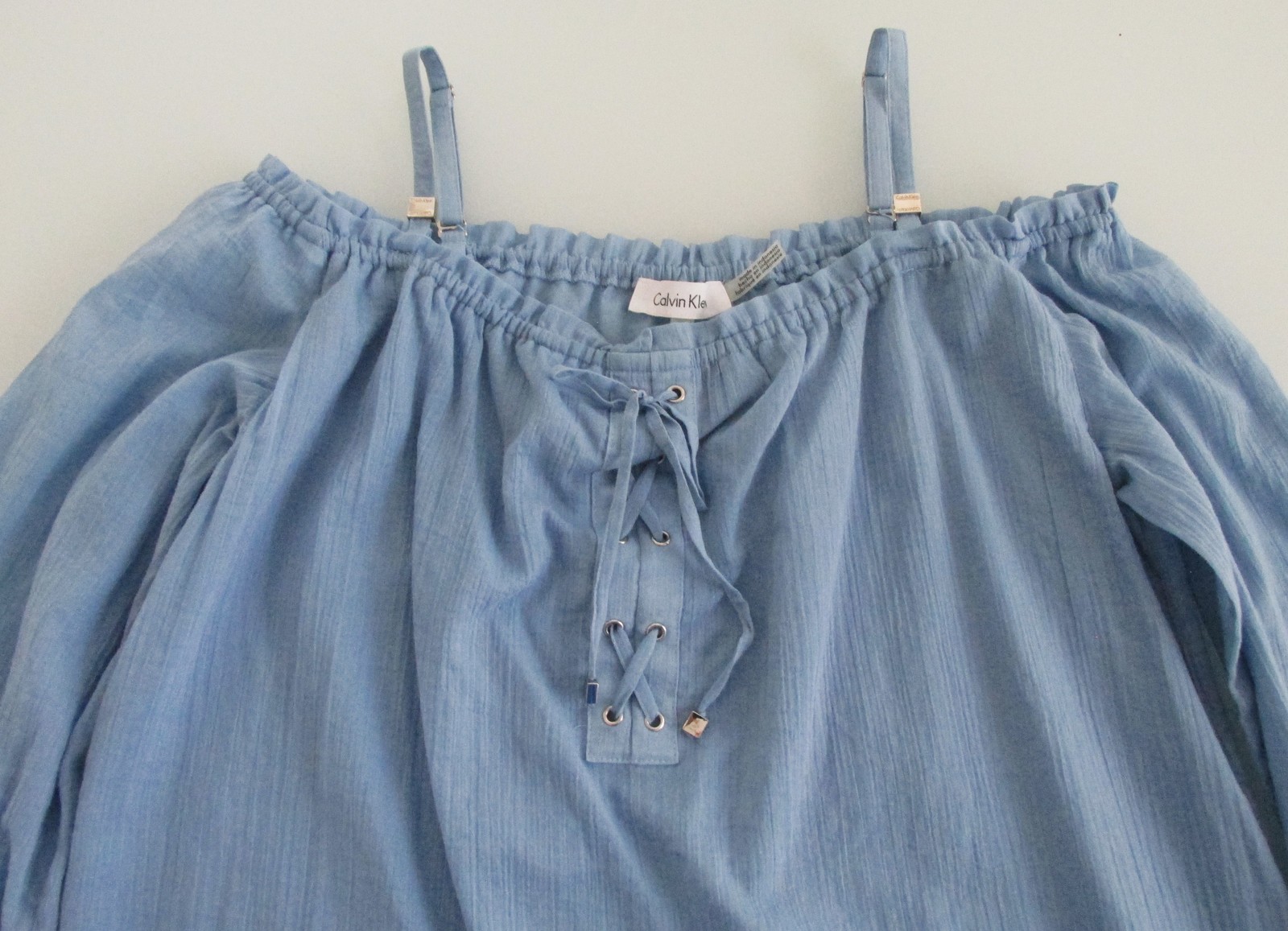 Description: Up for sale is a Calvin Klein (NWT) women's off-the-shoulder blouse. It is size small. It is made of 100% cotton fabric. This blouse is solid light blue. This blouse has an elasticized neck design with adjustable straps so it can be worn securely off the shoulder. It features a partial tie front and long sleeves with elasticized end. It also has a lightweight so the blouse is not sheer. It has a $79.50 price ticket attached.