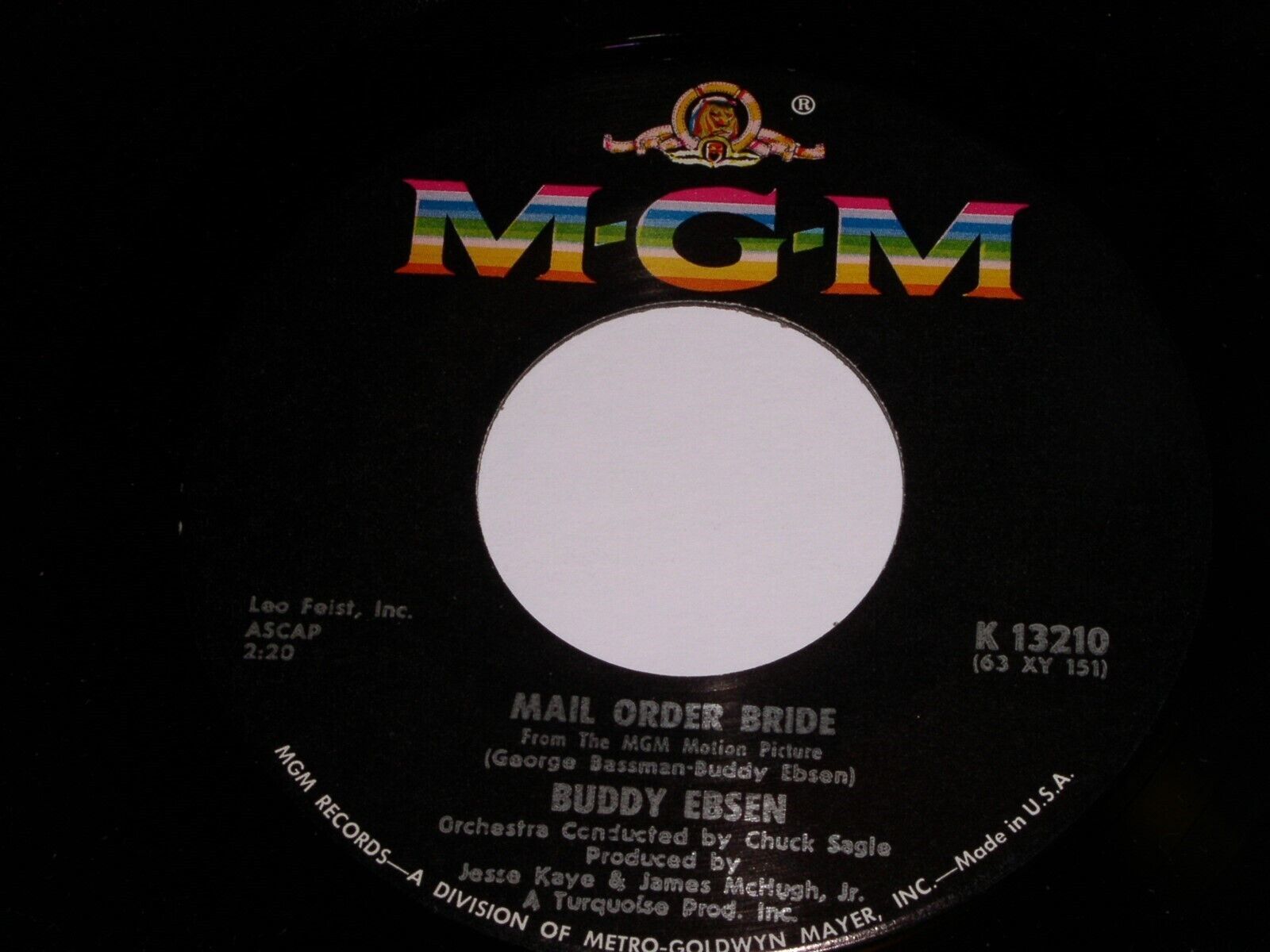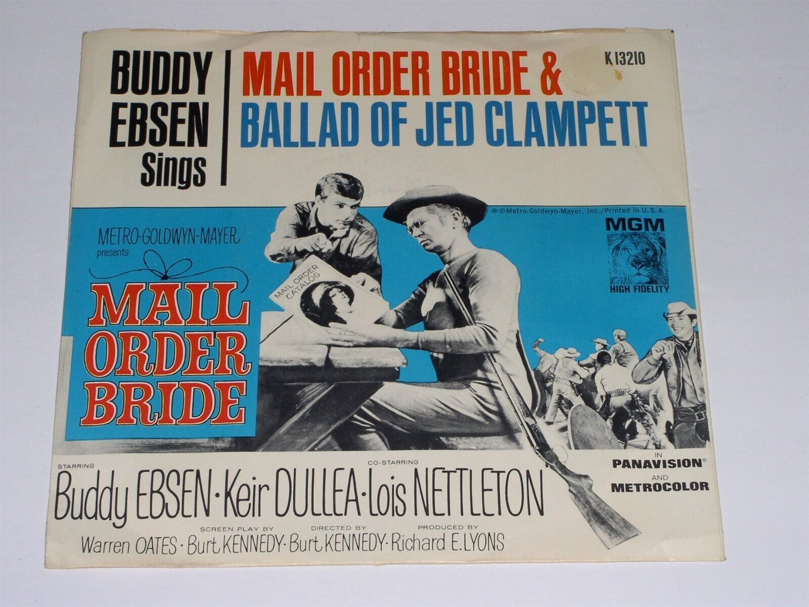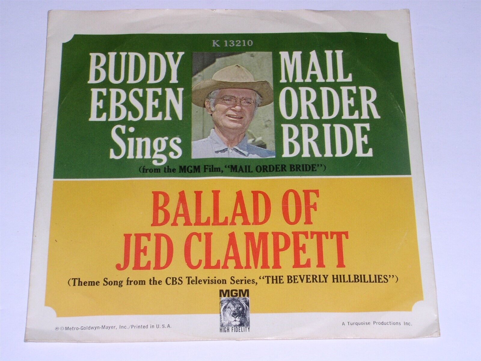 This is a vintage 45 rpm phonograph record by Buddy Ebsen, entitled, "Mail Order Bride". Flipside: "Ballad Of Jed Clamptee". Record label: MGM K 13210.