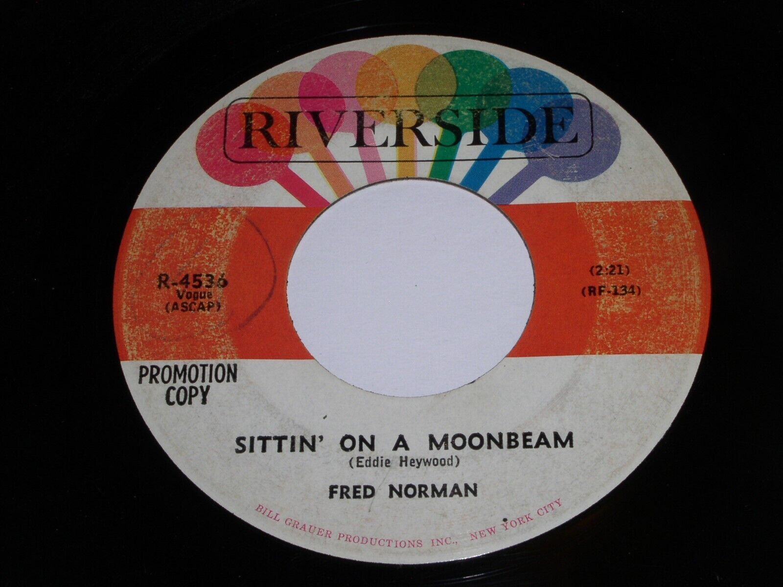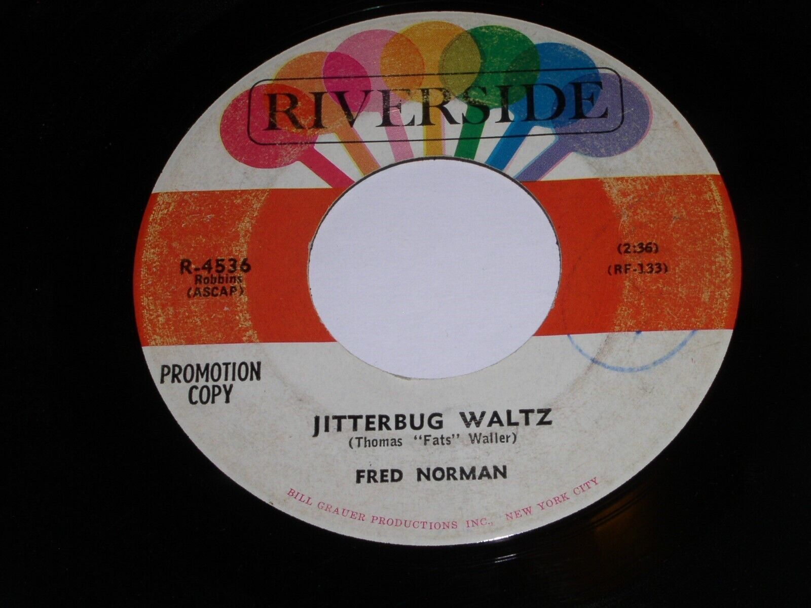 This is a vintage promotional 45 rpm phonograph record by Fred Norman, entitled, "Jitterbug Waltz". Flipside: "Sittin' On A Moonbeam". Record label: Riverside R-4536.