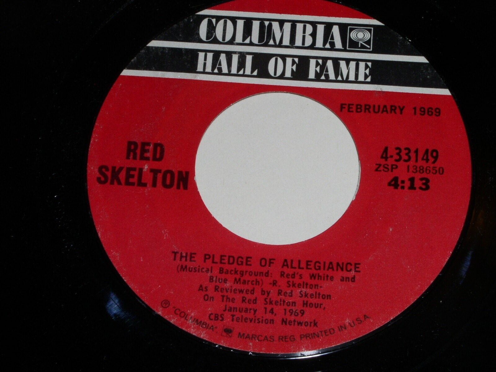 This is a vintage 45 rpm phonograph record by Red Skelton, entitled, "The Pledge Of Allegiance". Flipside: "The Circus". Record label: Columbia Hall Of Fame 4-33149. Comes with the original paper sleeve, making this all the nicer.