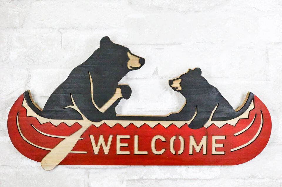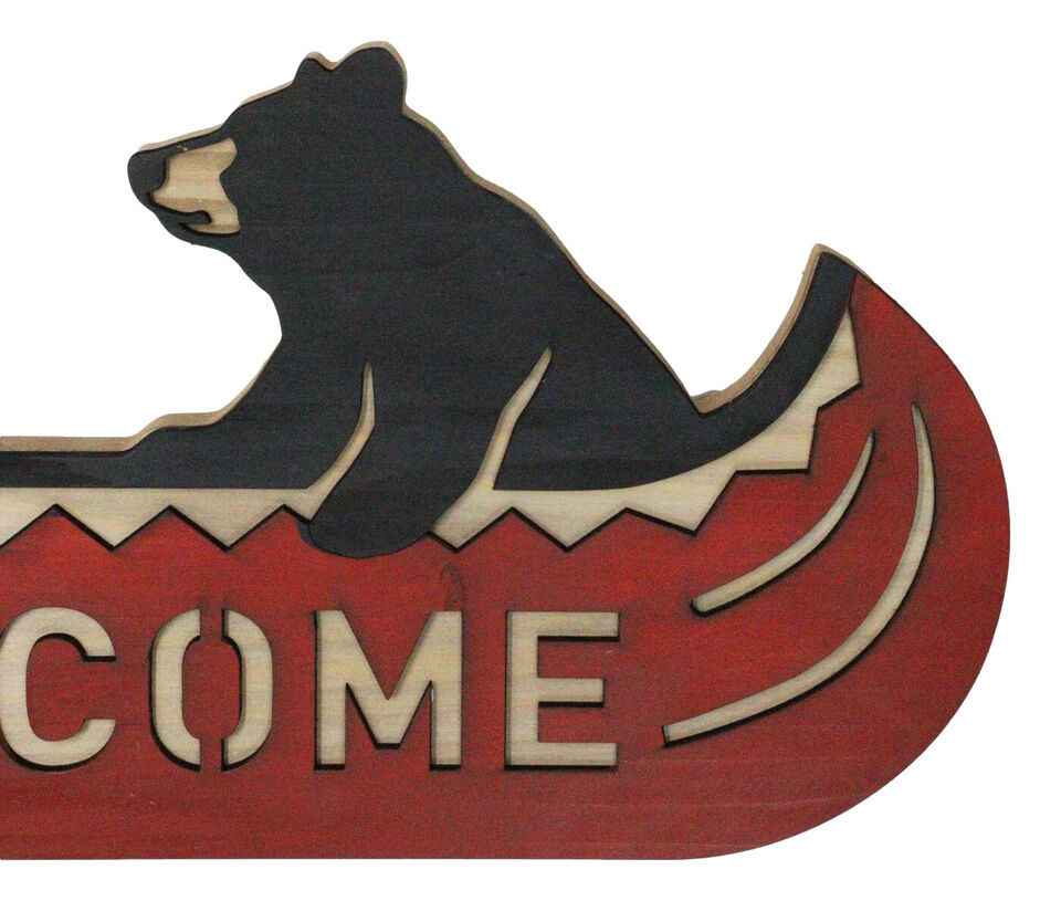 Rustic Father Bear With Cub Rowing Red Canoe Boat Welcome MDF Wall Decor Plaque