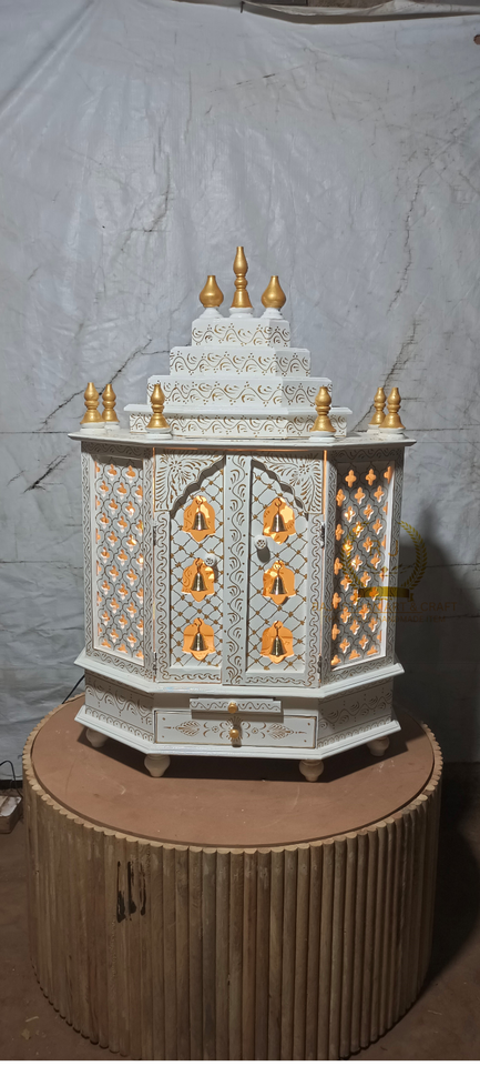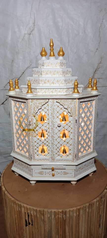 The temple is made of teak wood and white in color. It has 1 drawers, 1 puja she