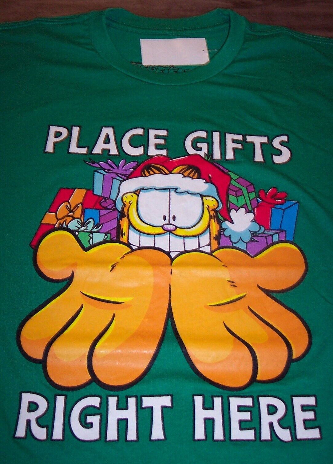 This is a GARFIELD "Place Presents Here" CHRISTMAS T-shirt. It is a size 2XL, and it is NEW with the tag. It is 25 inches from armpit to armpit and 32 inches in length. Combine auctions to save on shipping. AG