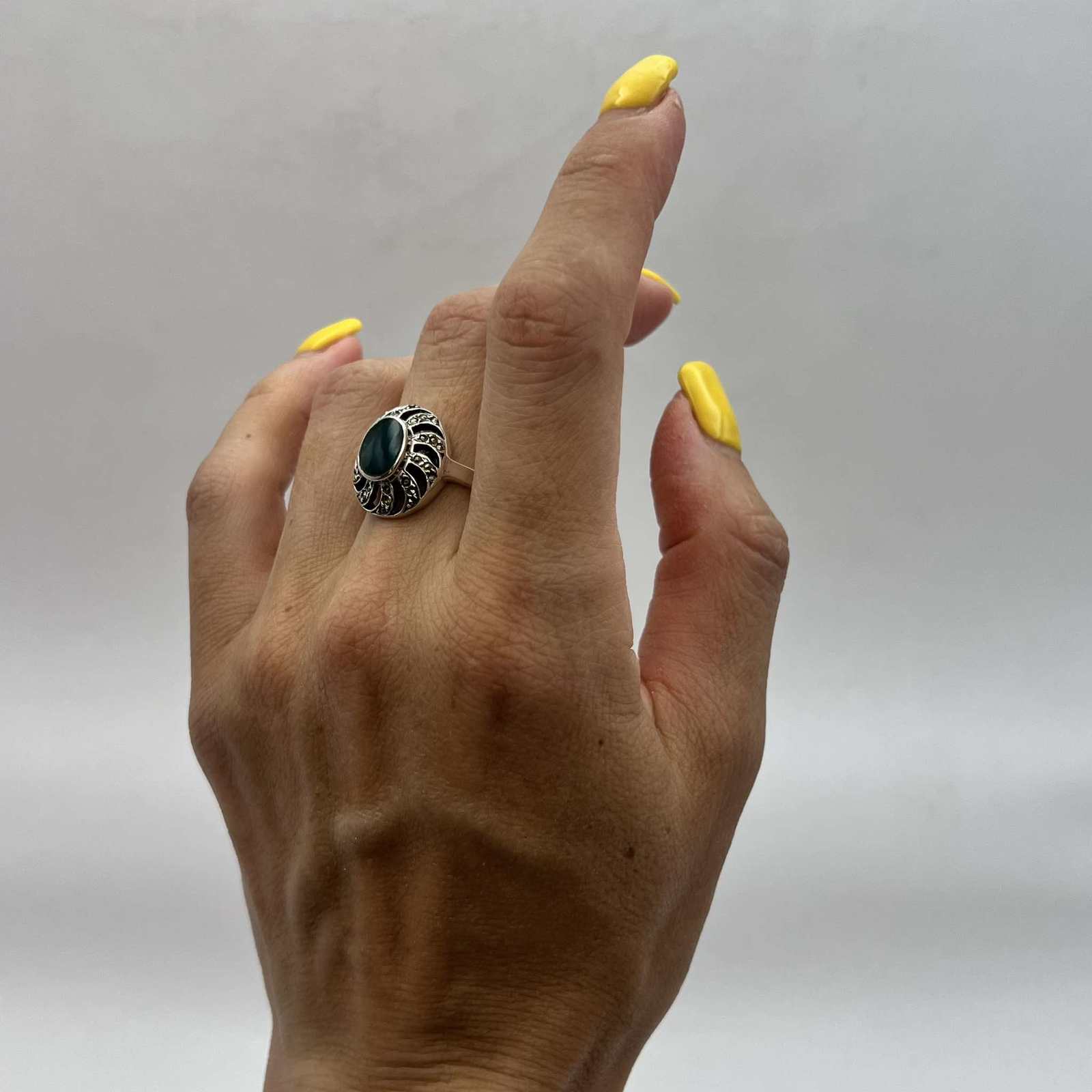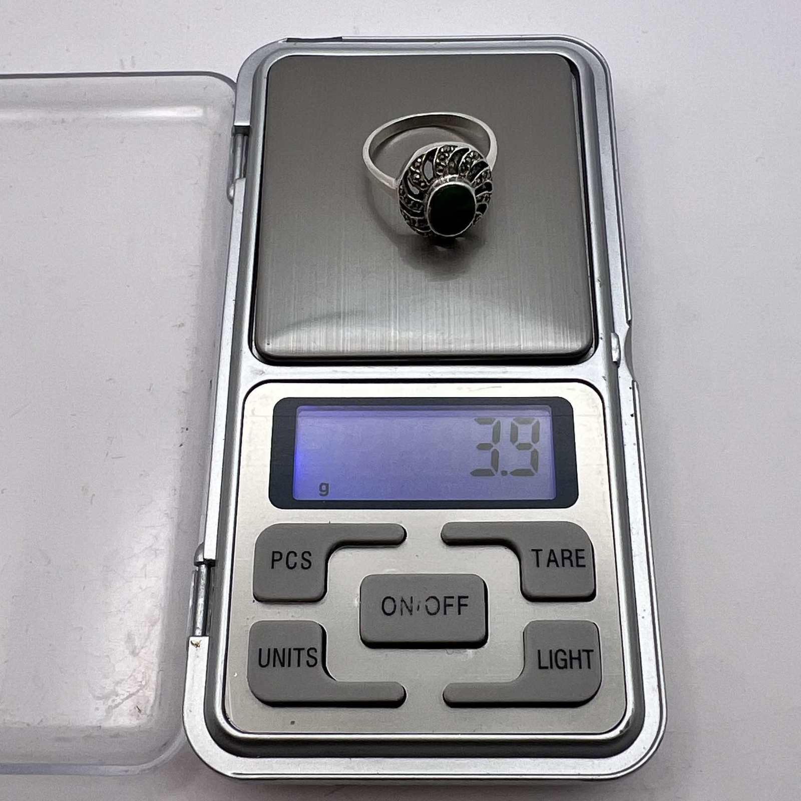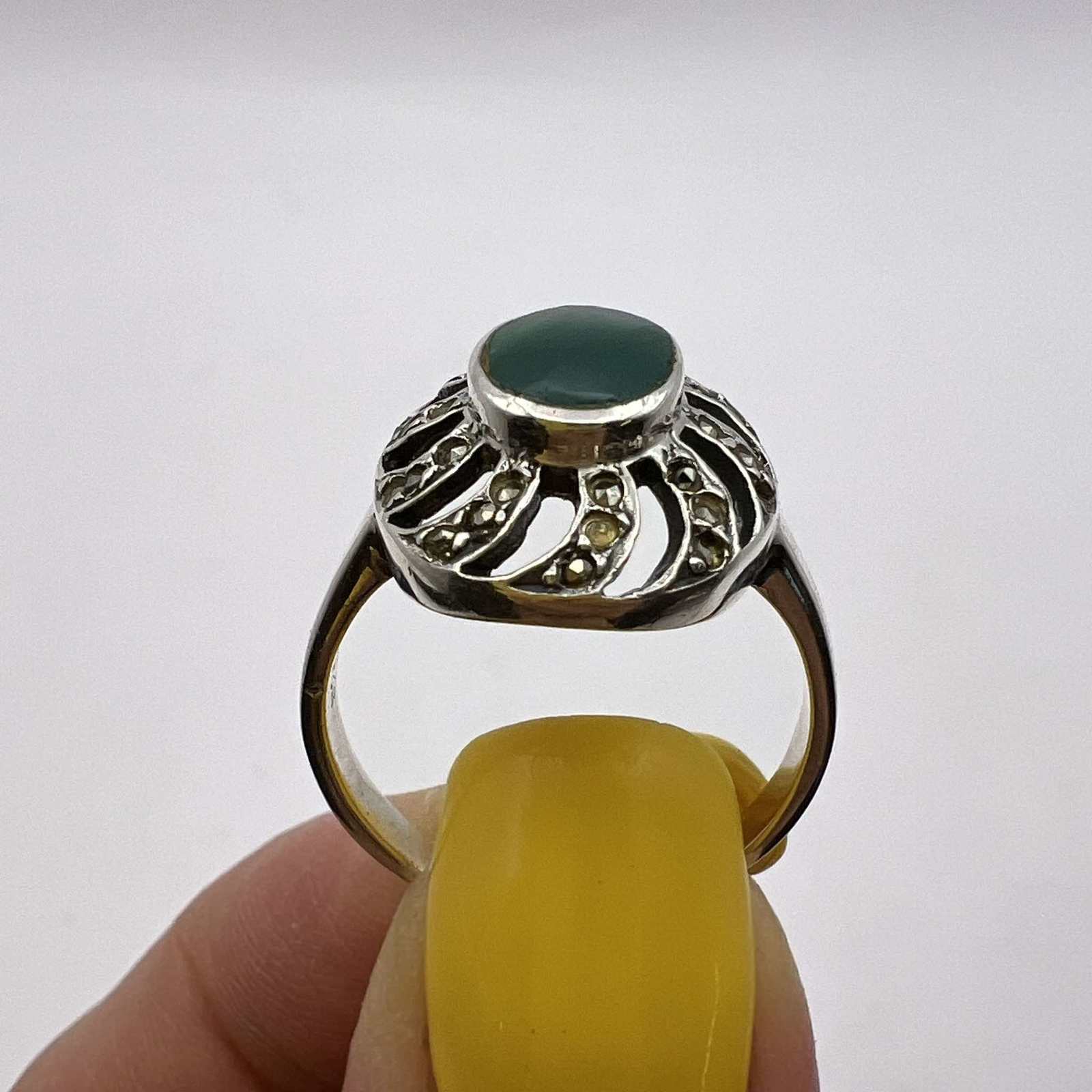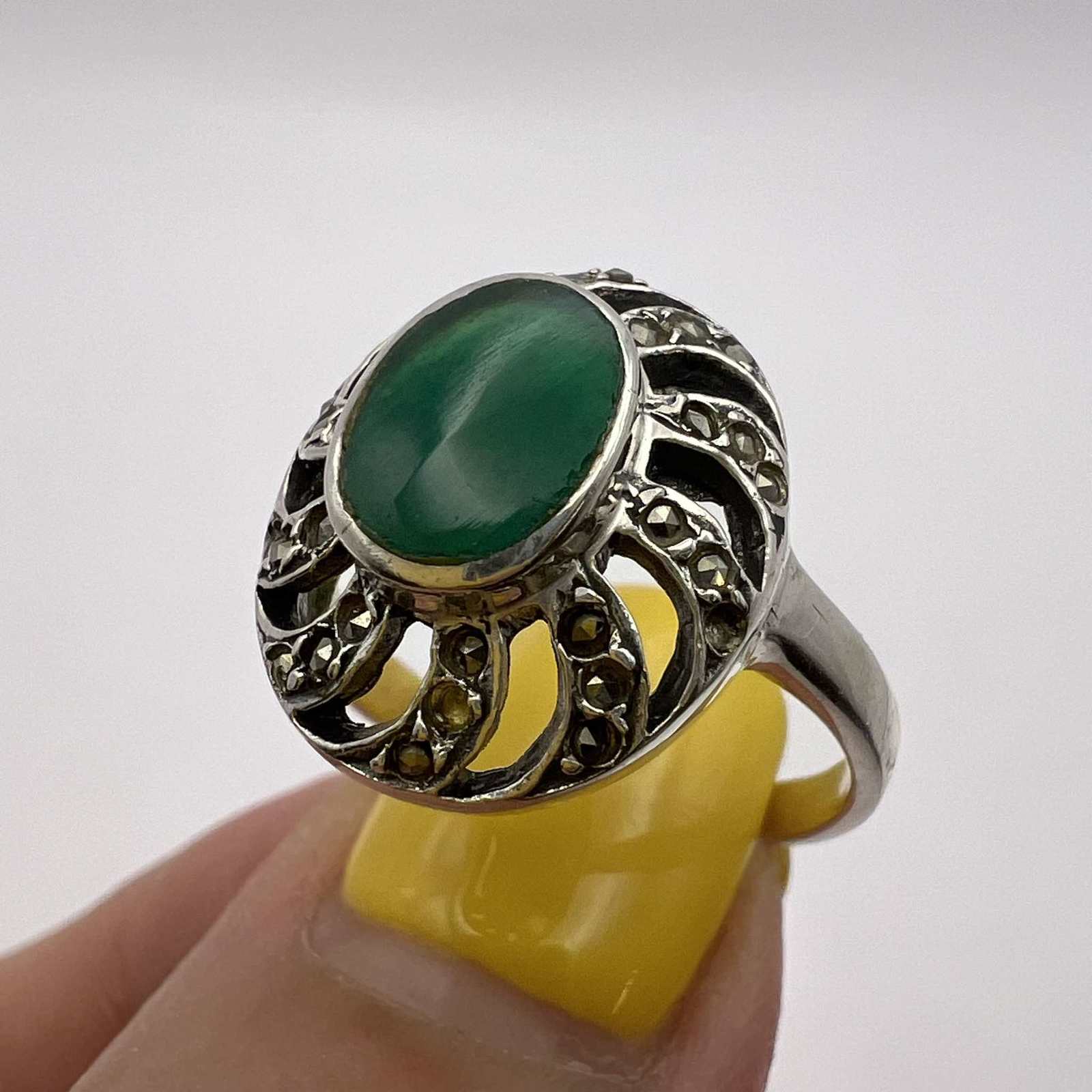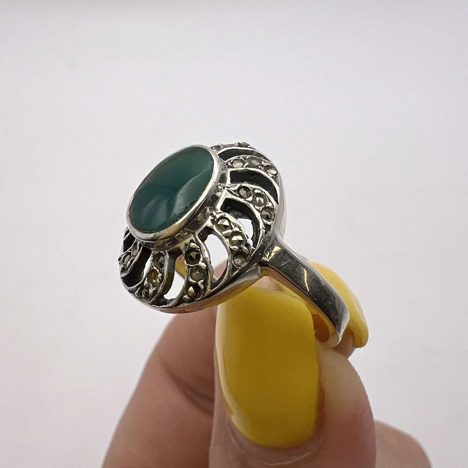 Green Agate Stone Marcasite Signed