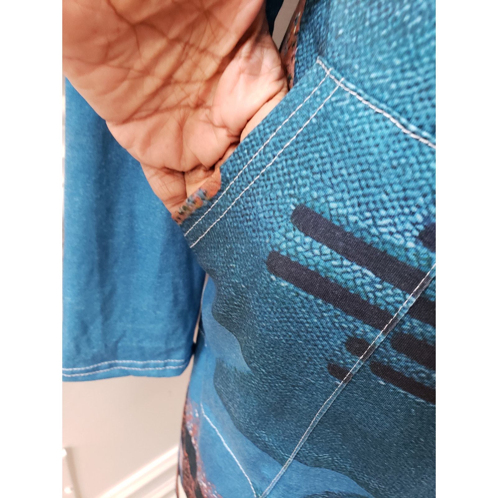 A-Line Dress Woemns 2XL Blue Geo Print Stretch Long Sleeve V Neck Side Pockets