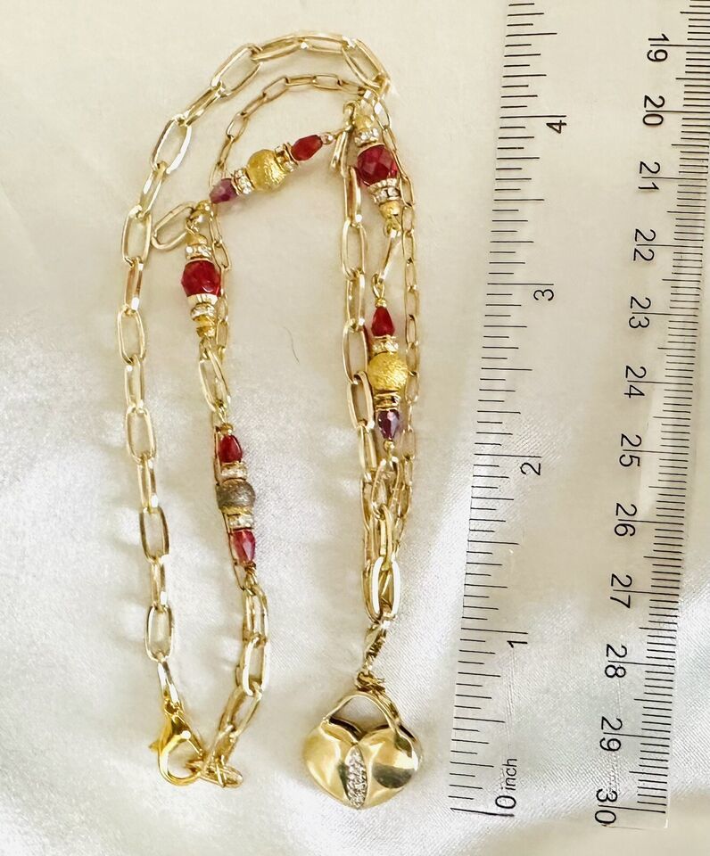 This exquisite handmade one of a kind necklace features a unique asymmetrical design with a stunning heart-shaped pendant and paper clip chain adorned with sparkling red crystals. The necklace is perfect for any occasion, adding a touch of elegance and sophistication to your outfit.
