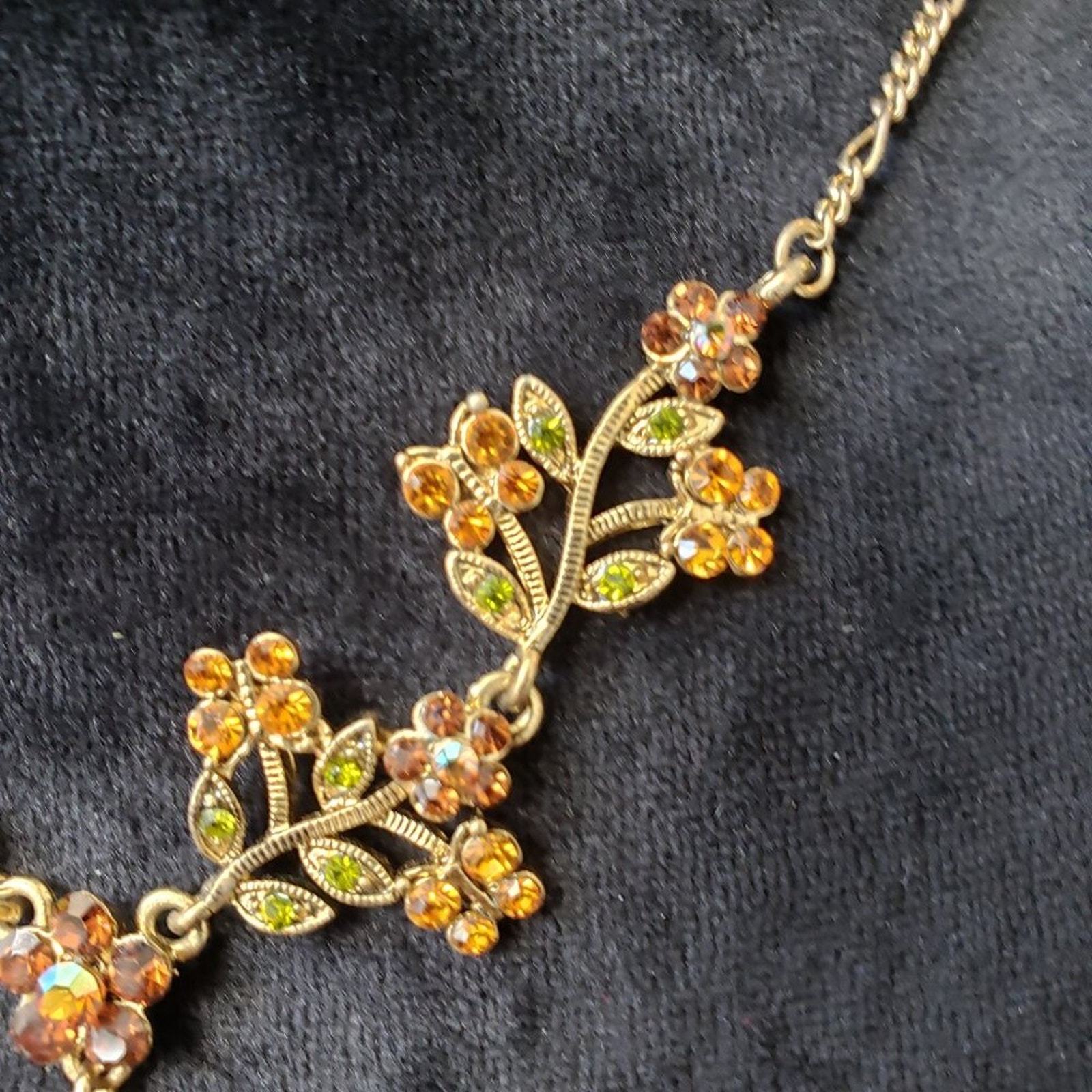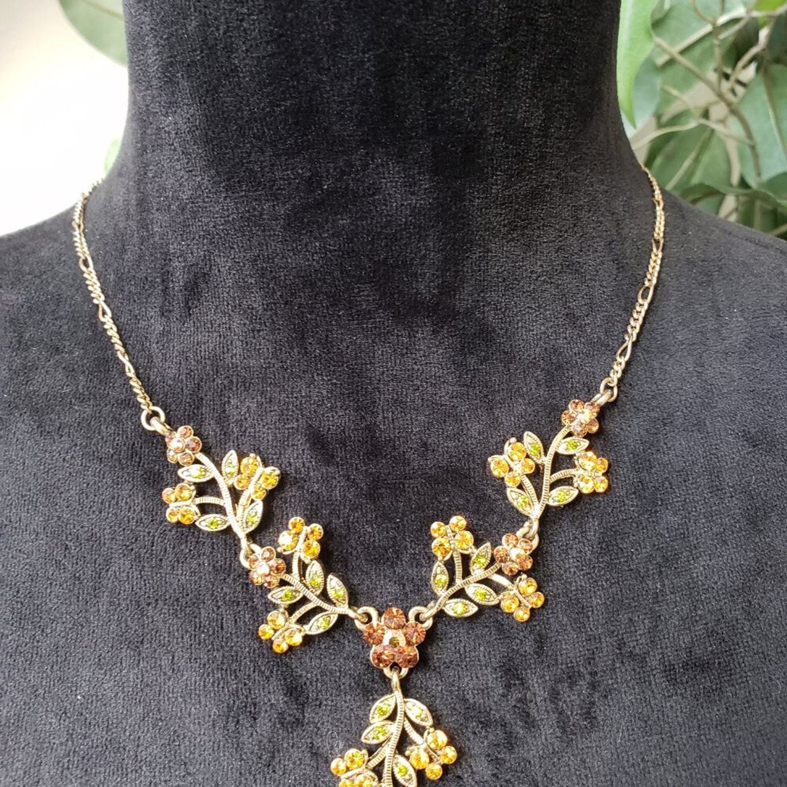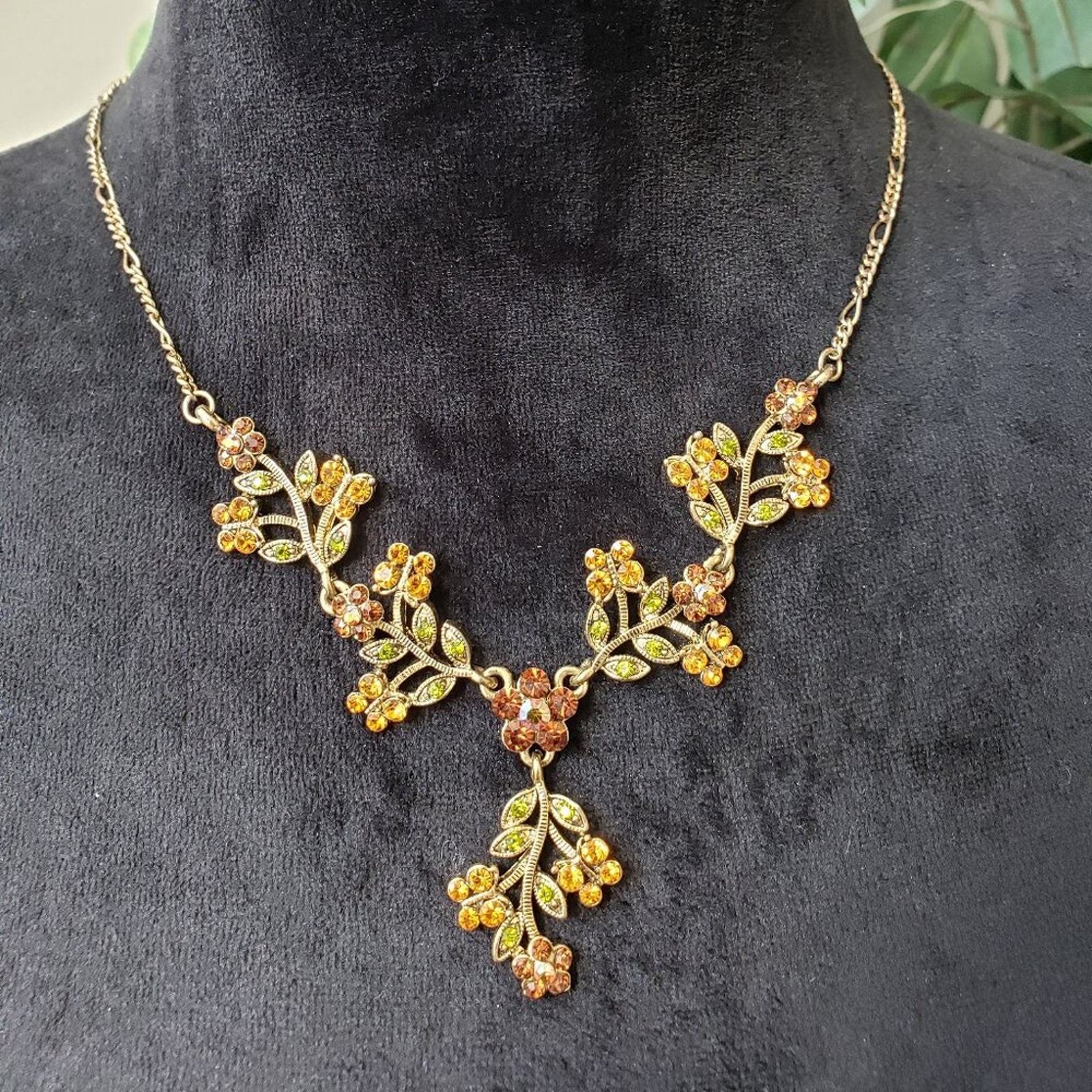 Vintage Yellow & Brown Crystal Leaf Flower Pendant Necklace with Lobster Clasp