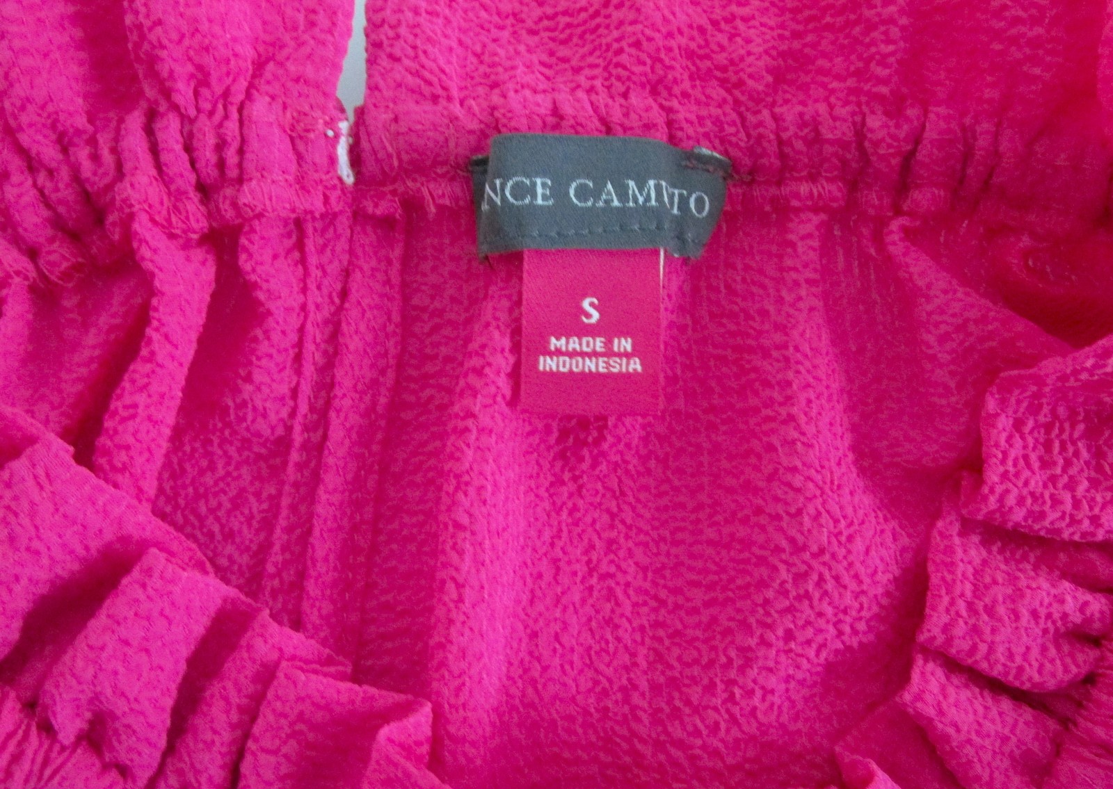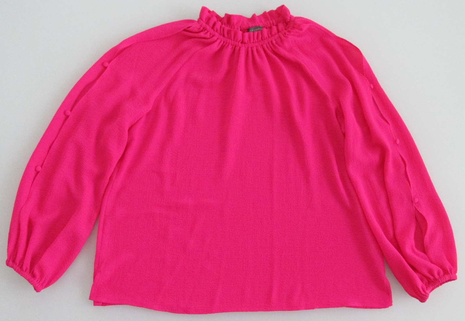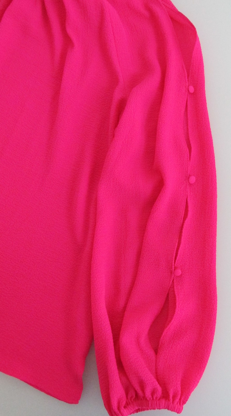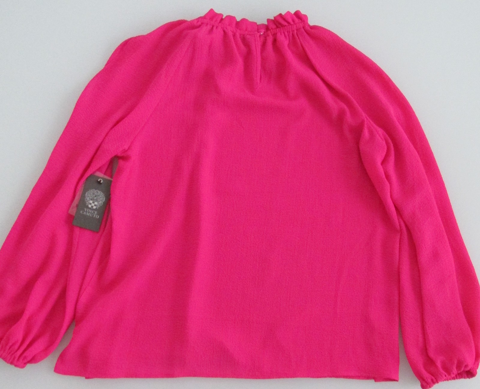 Description: Up for sale is a Vince Camuto (NWT) women's open-shoulder and sleeve blouse. The size is small. The color is hot pink. It is made of 98t polyester/2% spandex lightweight fabric. This blouse has an elasticized ruffled neck design and is accented by dramatic open shoulders sleeves from the neck to the bottom of the elasticized cuff. It features 2 bottom side slits with a button neck back. This blouse has a $79.00 price ticket attached.