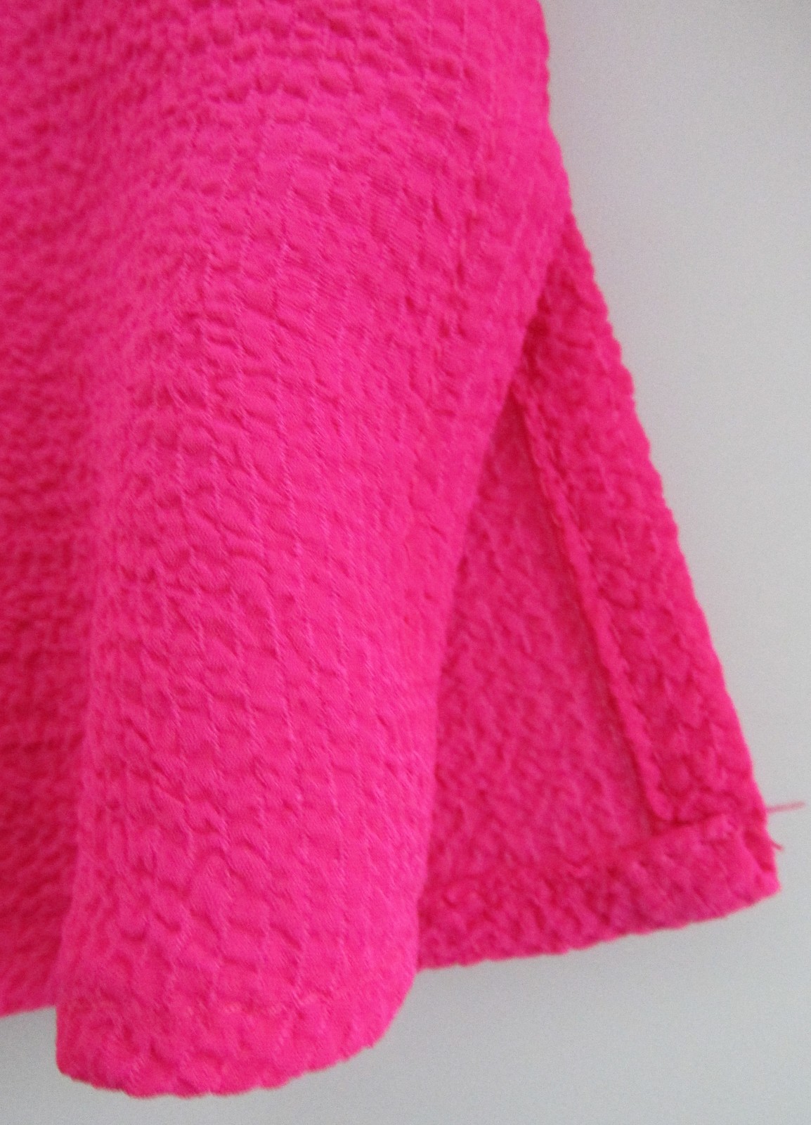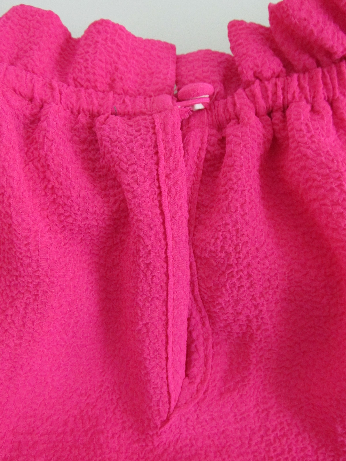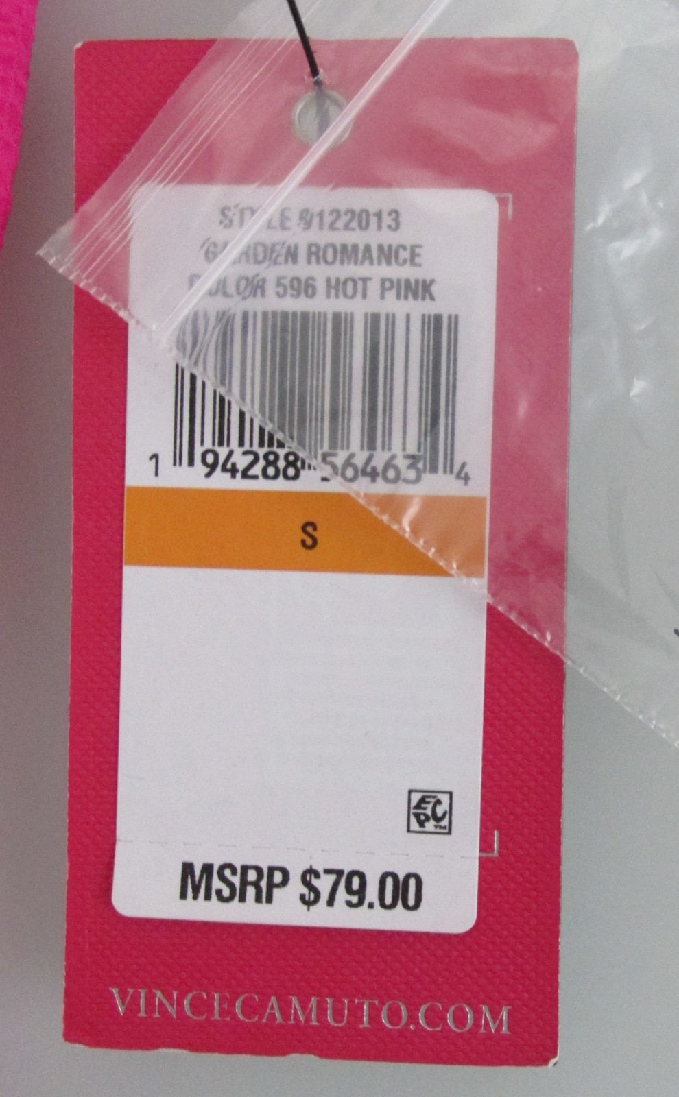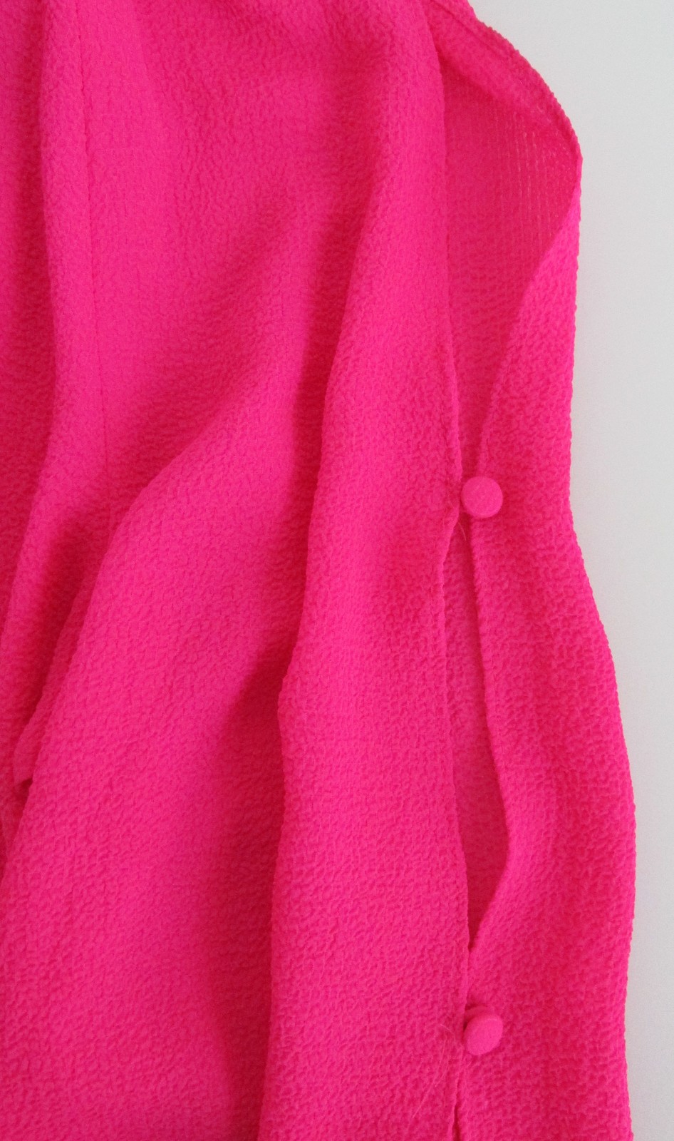 Description: Up for sale is a Vince Camuto (NWT) women's open-shoulder and sleeve blouse. The size is small. The color is hot pink. It is made of 98t polyester/2% spandex lightweight fabric. This blouse has an elasticized ruffled neck design and is accented by dramatic open shoulders sleeves from the neck to the bottom of the elasticized cuff. It features 2 bottom side slits with a button neck back. This blouse has a $79.00 price ticket attached.