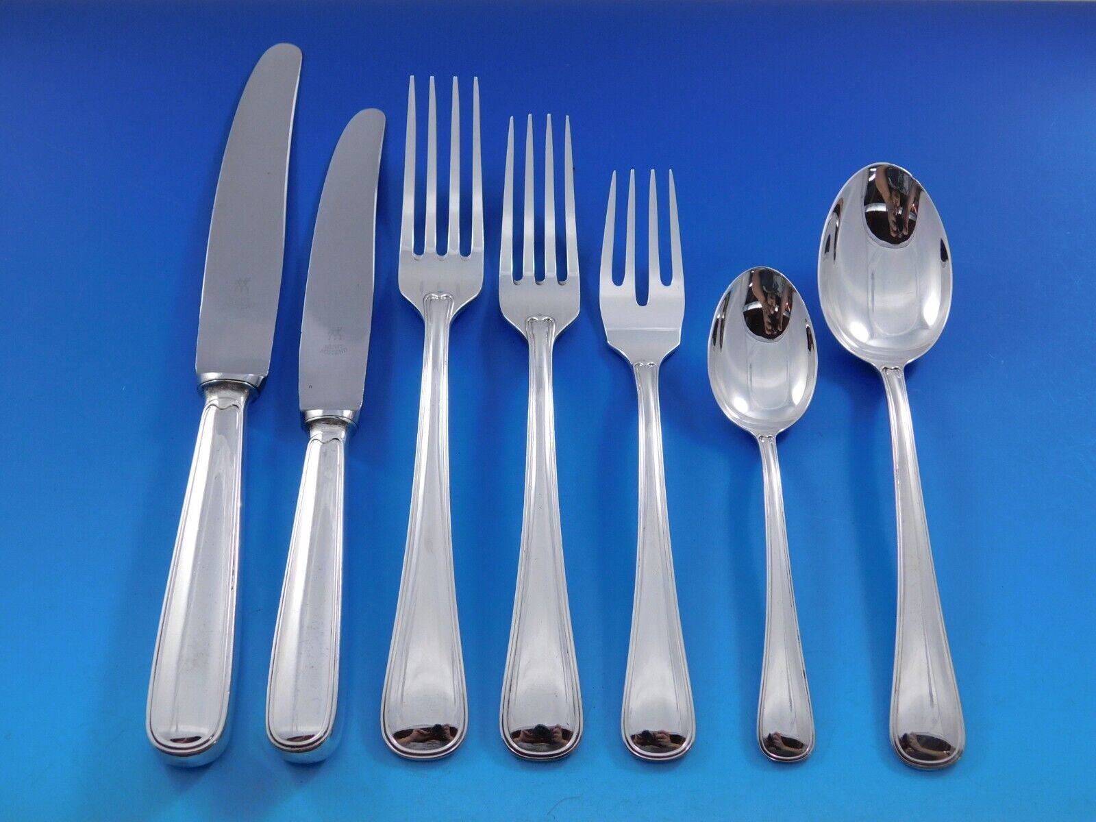 Good vintage condition, with no monograms. Sime minor imperfections on the knives and blades, as expected with age. This set will be beautifully professionally polished and sealed in individual plastic sleeves prior to shipping. Outstanding set!