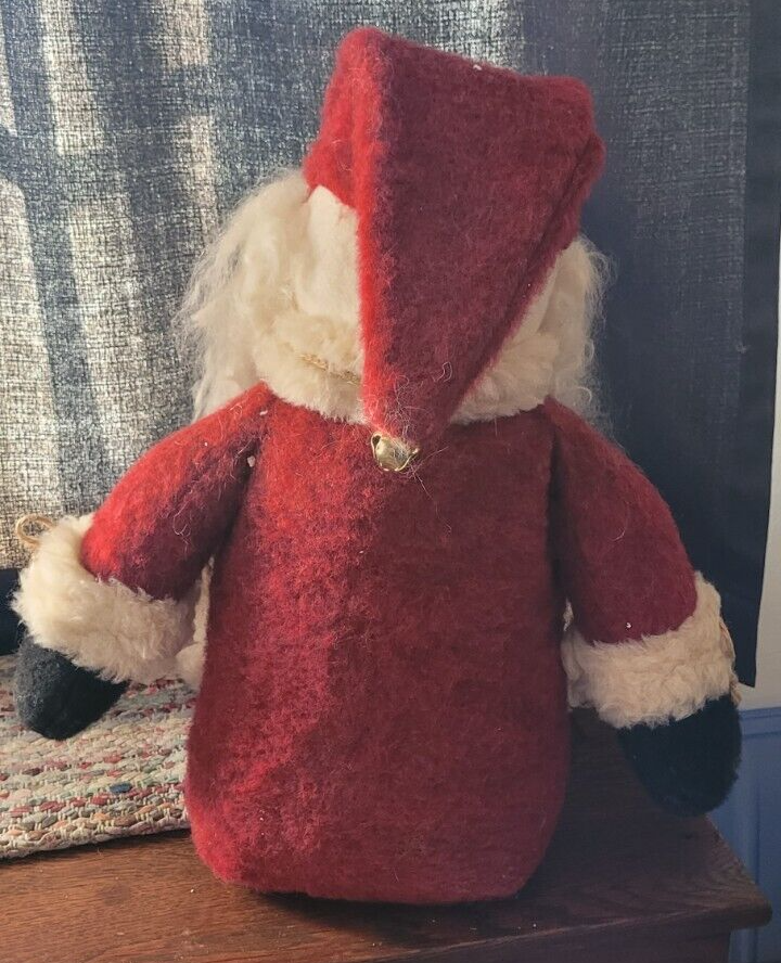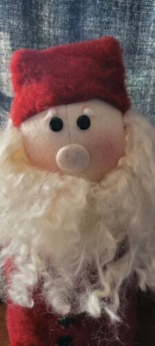 This Santa is in good used condition. It does show some wear around the beard. There are no stains or holes that I found. It measures approximately 17 inches tall in the seated position. It is heavy. Not sure what's inside it to make it heavy. It would make a nice addition to a collection or for holiday decoration.