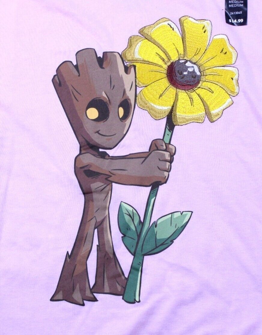 NWT Marvel Groot & Flower Embroidered Graphic Adult T-Shirt Light Pink Size Med