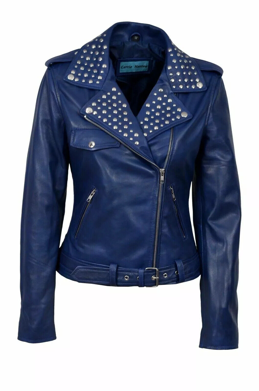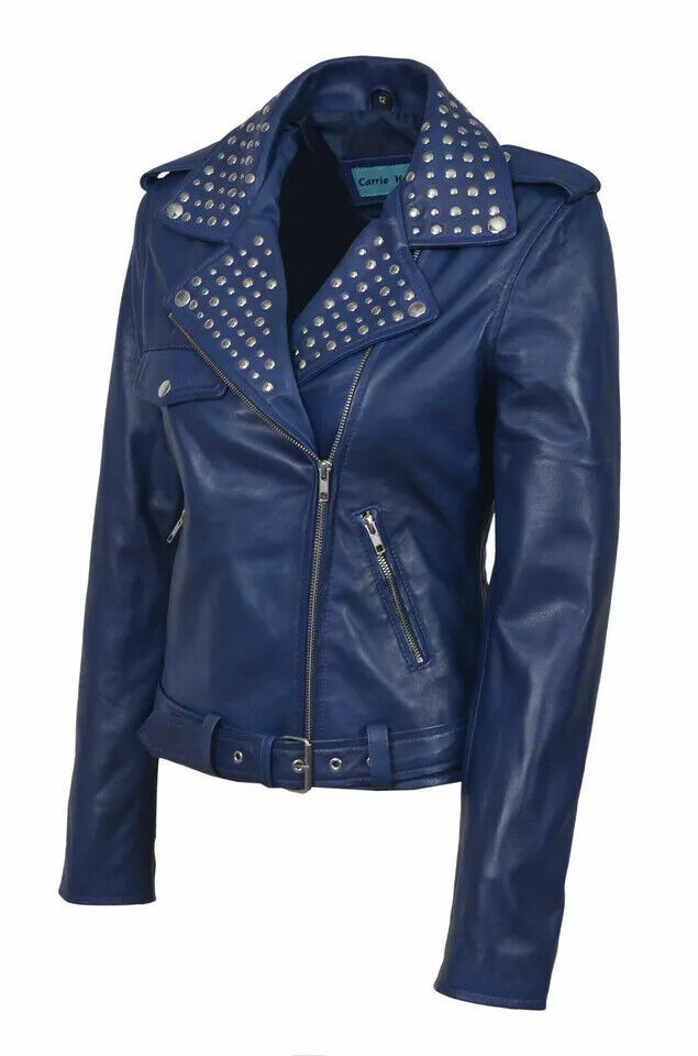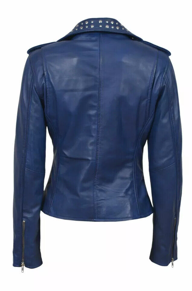 Women's Lambskin Leather Jacket Biker Belted New Motorcycle Blue Stylish Jacket