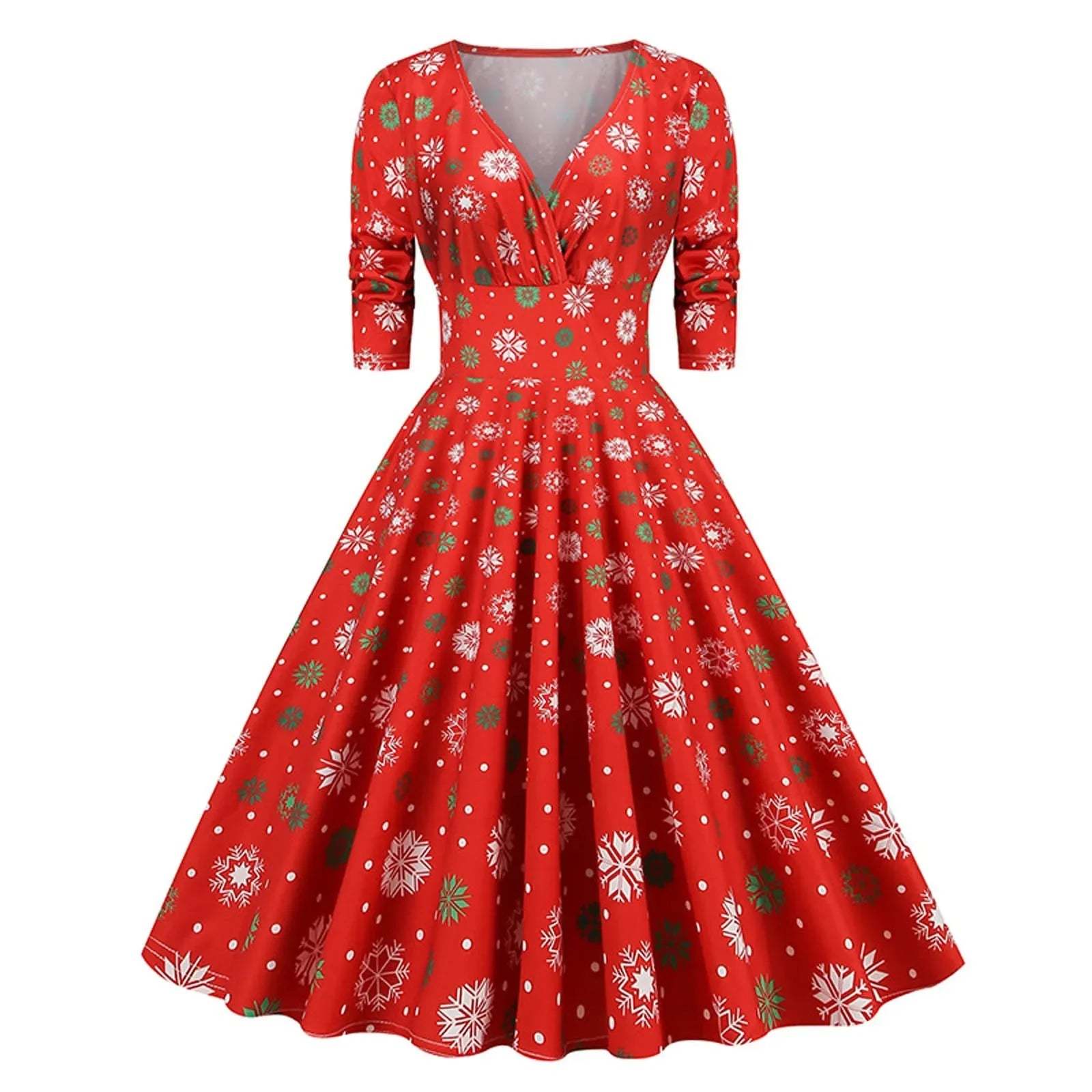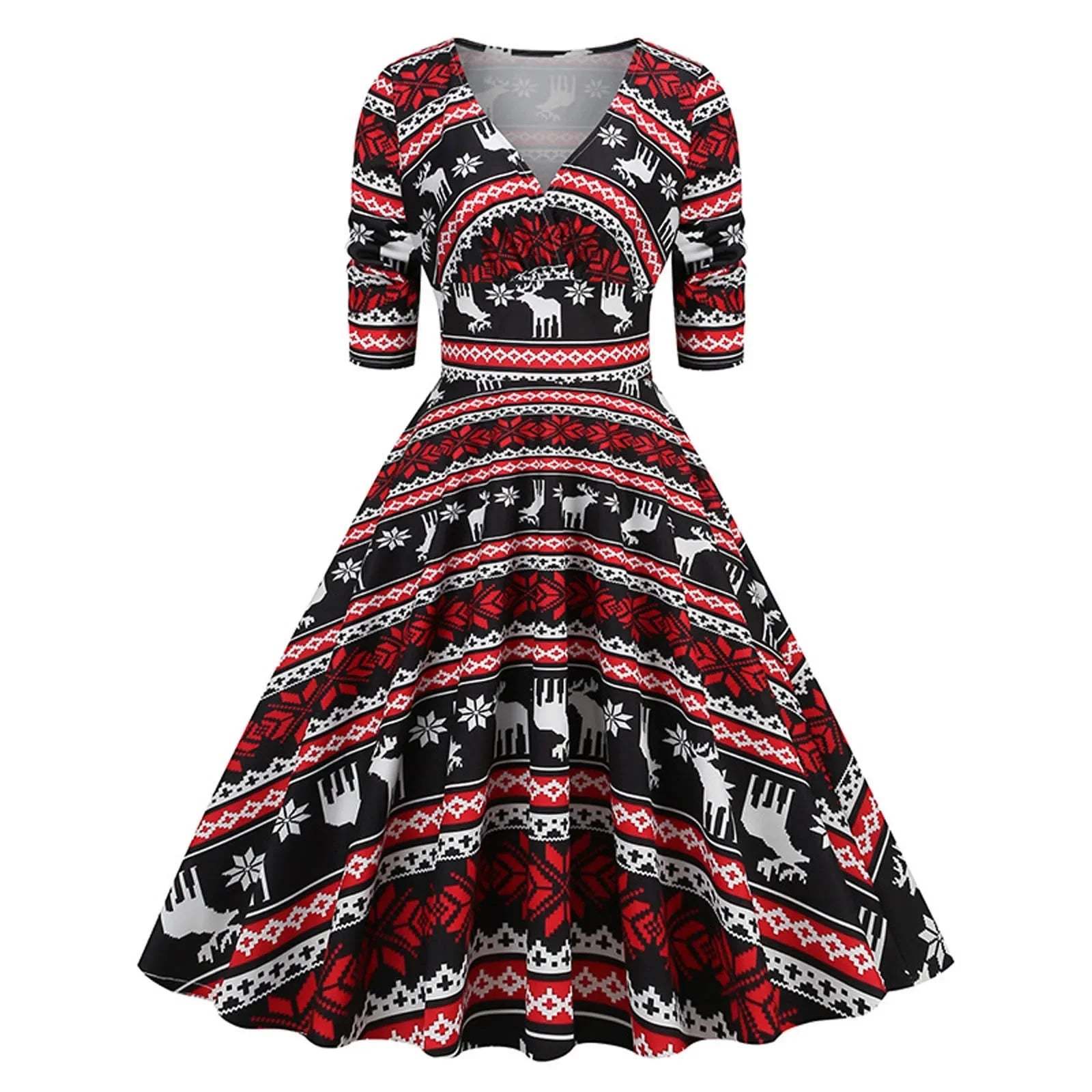 2024 Christmas Deer and Tree Print Christmas Party V-Neck High Waist 50s Vintage