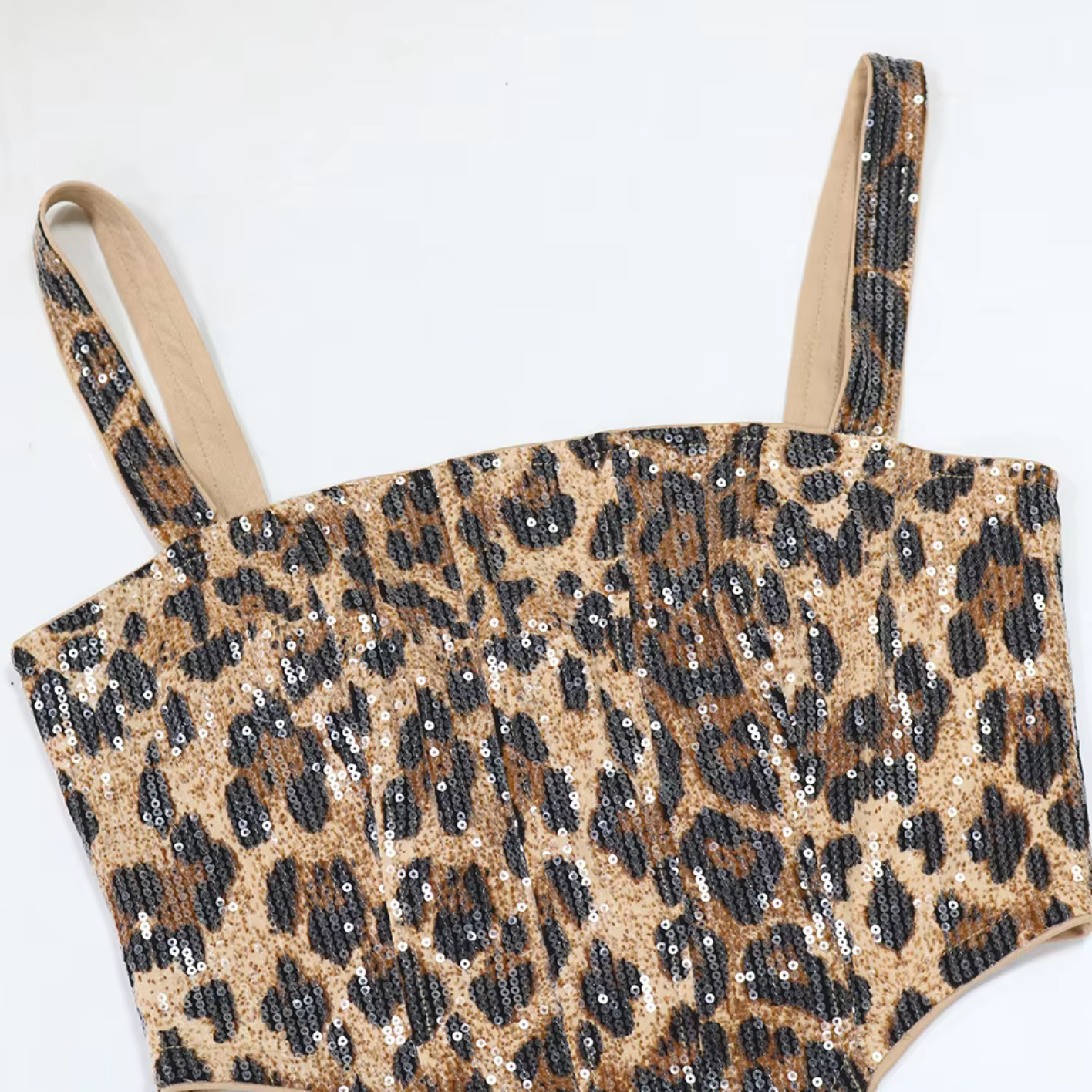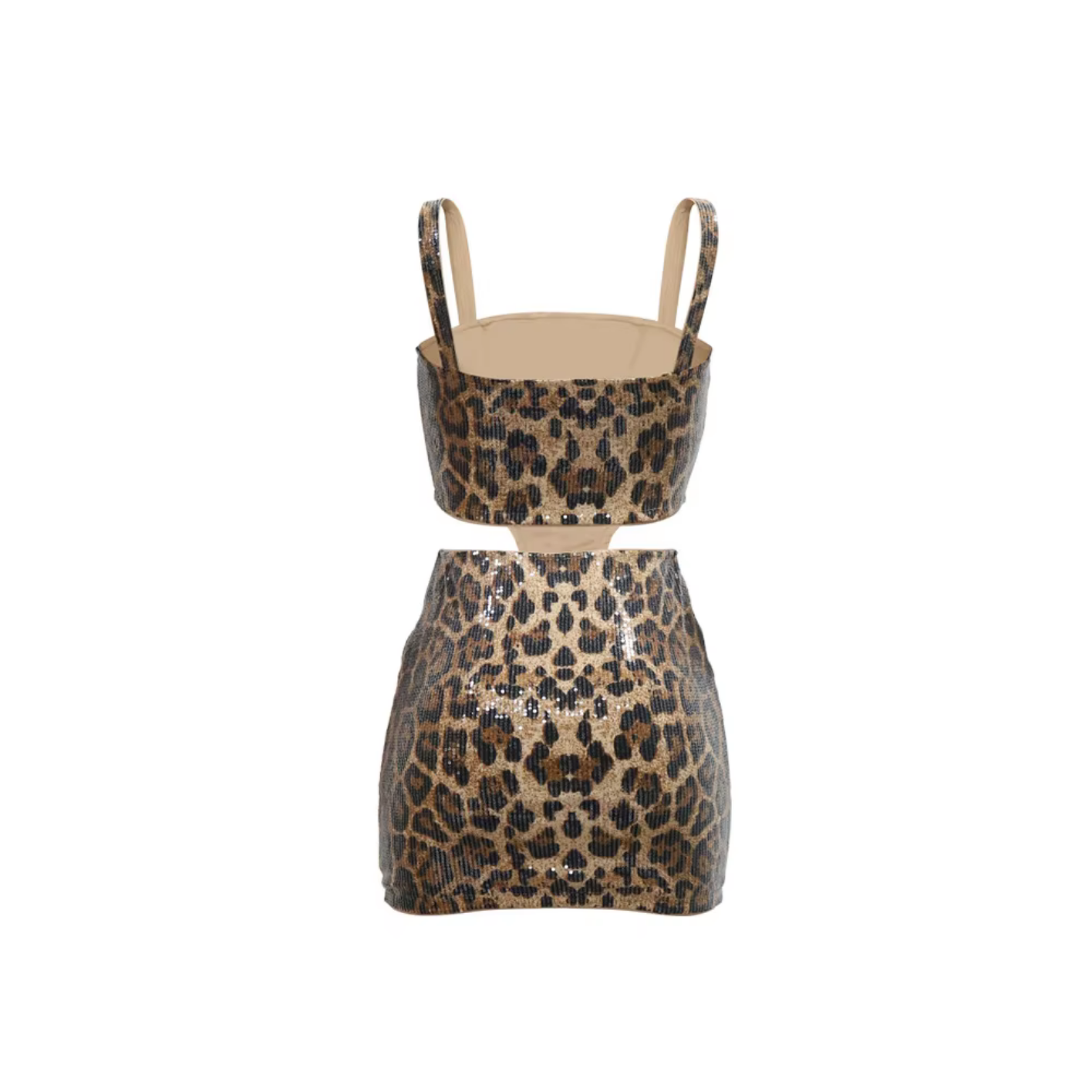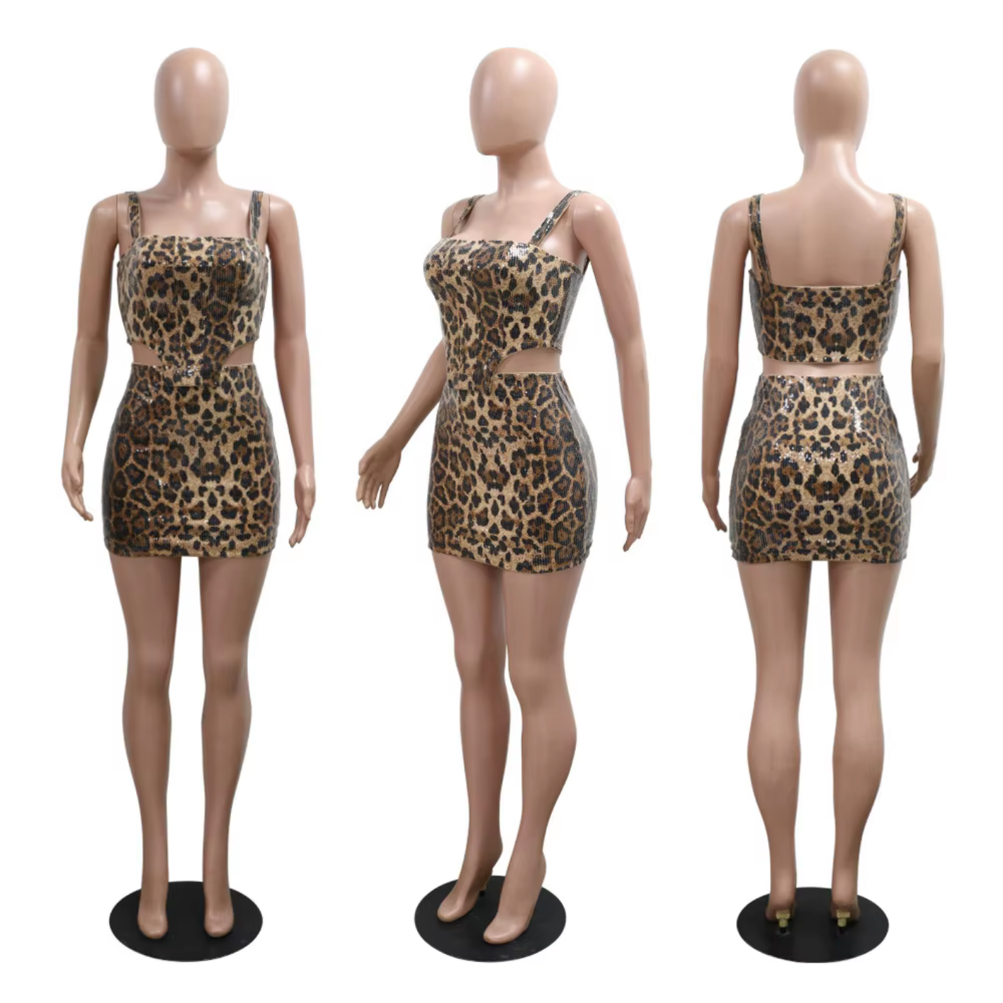 Sexy Leopard Print Sequin Irregular Tank Top And Mini Skirts Club Suits
