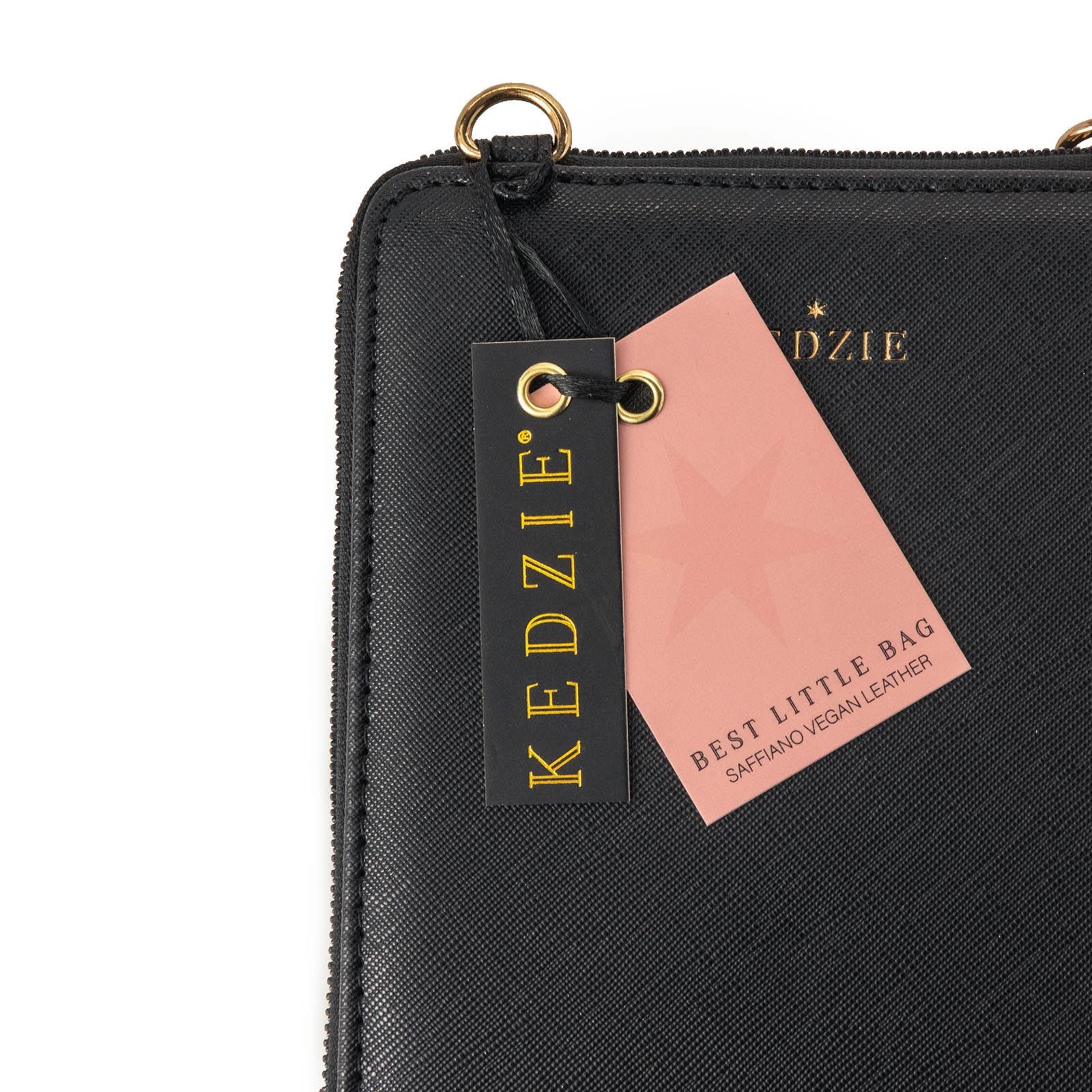 This perfectly sized crossbody opens vertically to store a full-sized smart phone and all your essentials with gorgeous saffiano vegan leather and smooth-glide resin zippers. Contrasting tape, a removable, adjustable strap and gold branding finish off this sleek accessory. Compatible with interchangeable purse straps