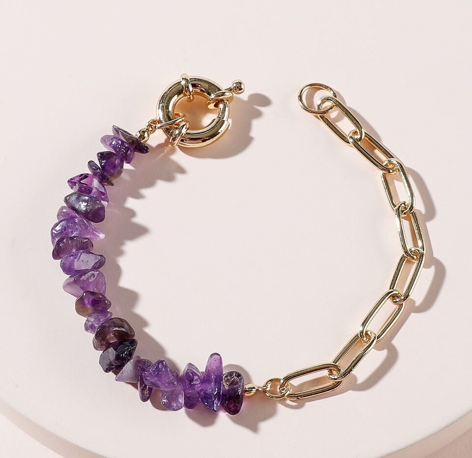 This bracelet is handcrafted with genuine Amethyst. Each stone is raw and different in shape and size. Tiny gold or silver beads dot between each stone, as well.