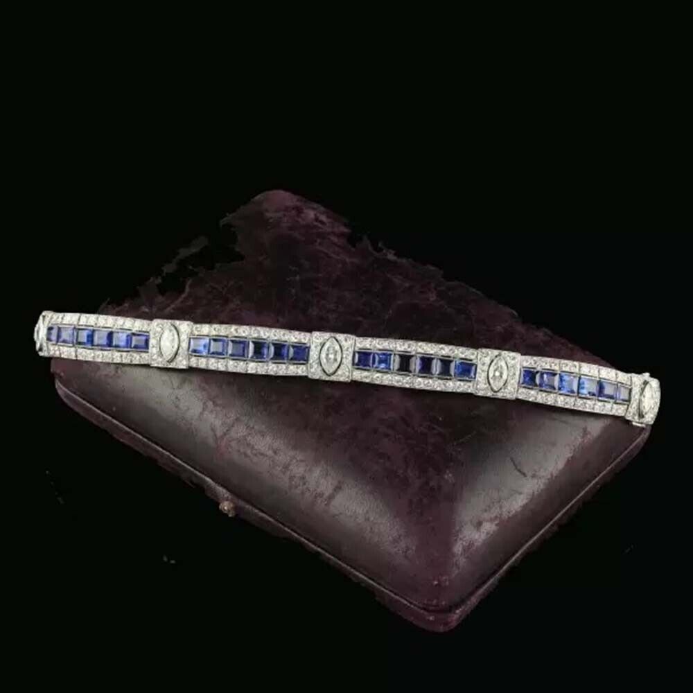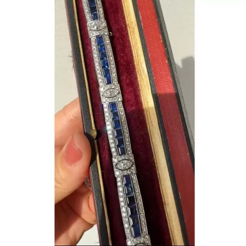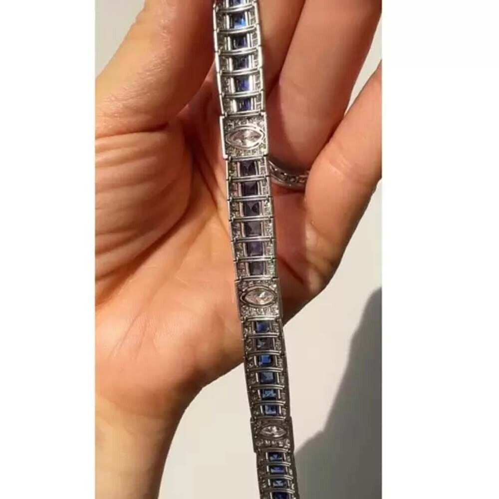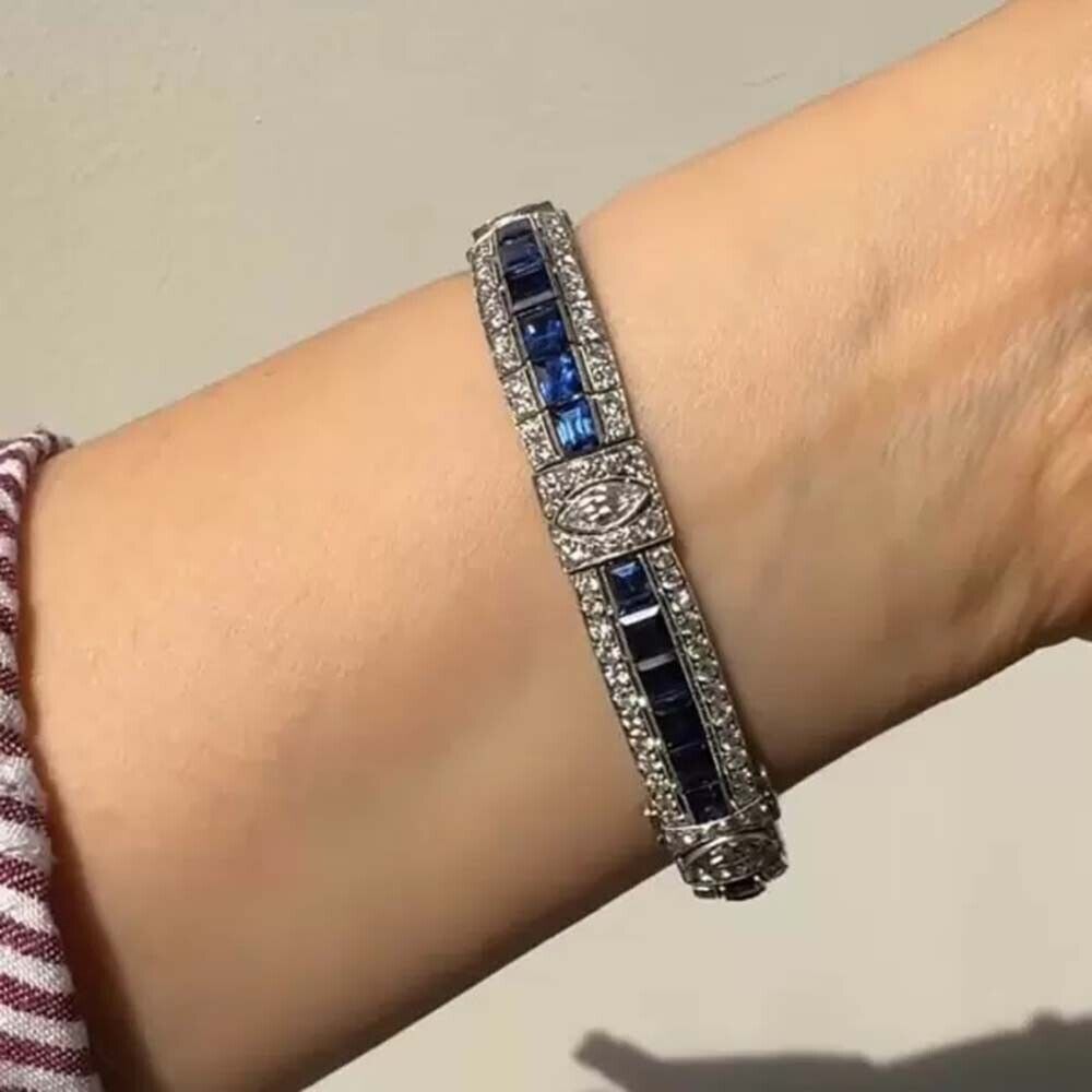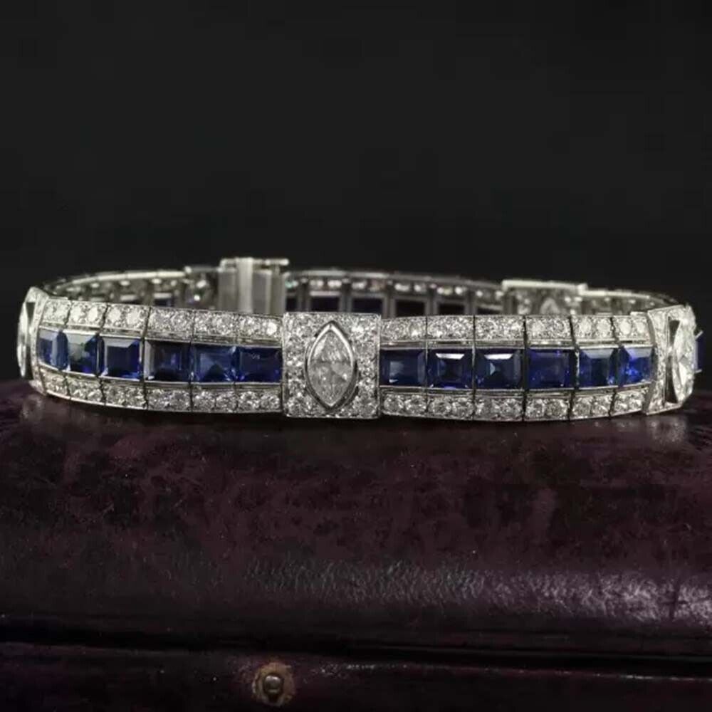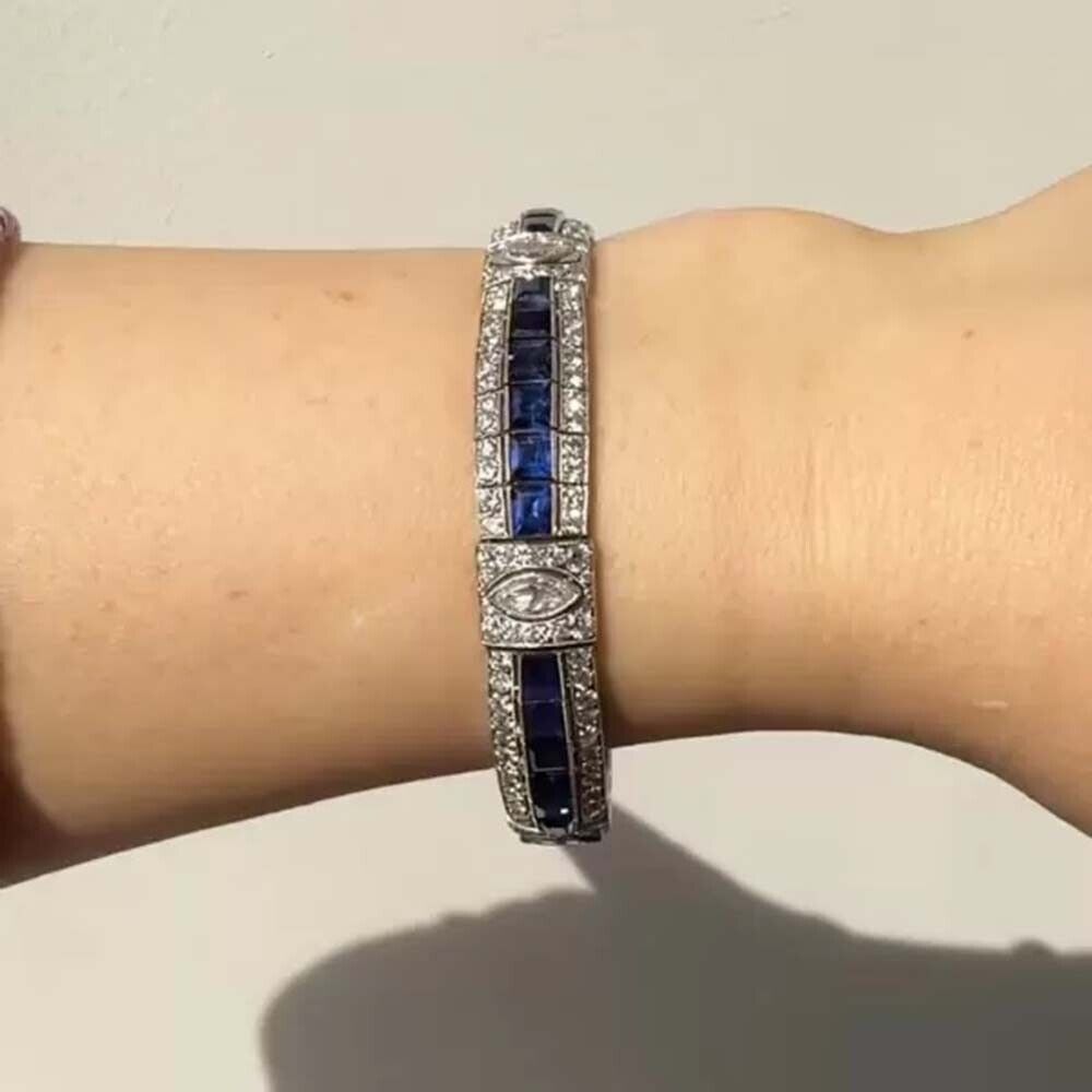 18 Ctw Created Blue 14K White Gold Over Art Deco Vintage Bracelet With Free Gift