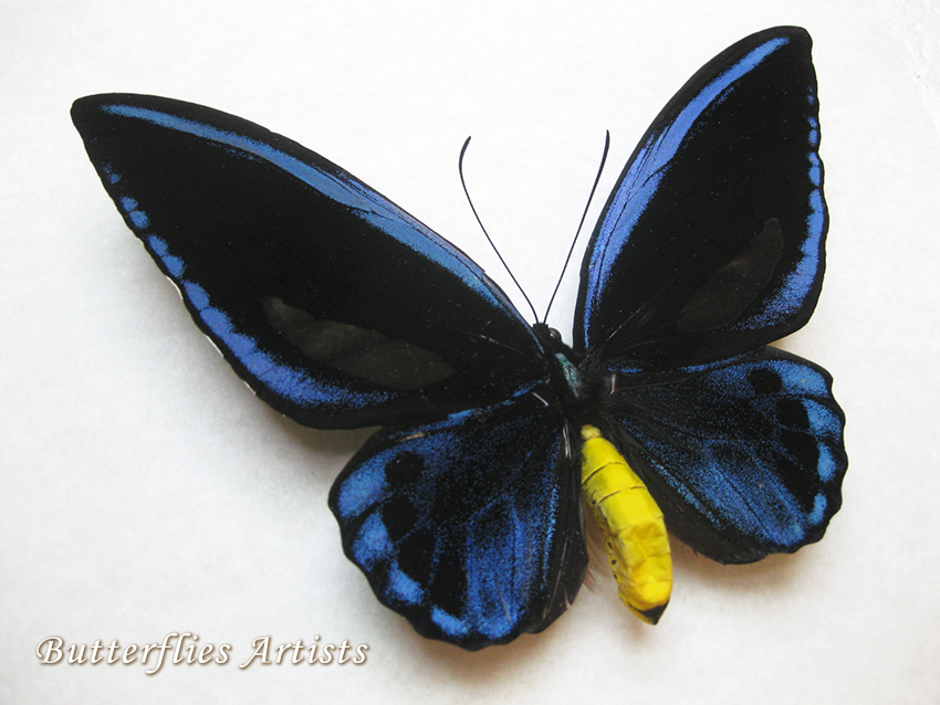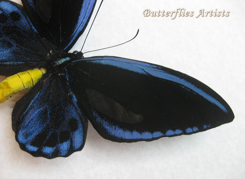Rarely offered butterflies Ornithoptera priamus urvillianus or the Priam's Blue Birdwing is a butterfly belonging to the Papilionidae family of butterflies. The Priam's Blue Birdwing is one of the largest and most beautiful butterflies in Asia. The stunning blue and glossy black wings.