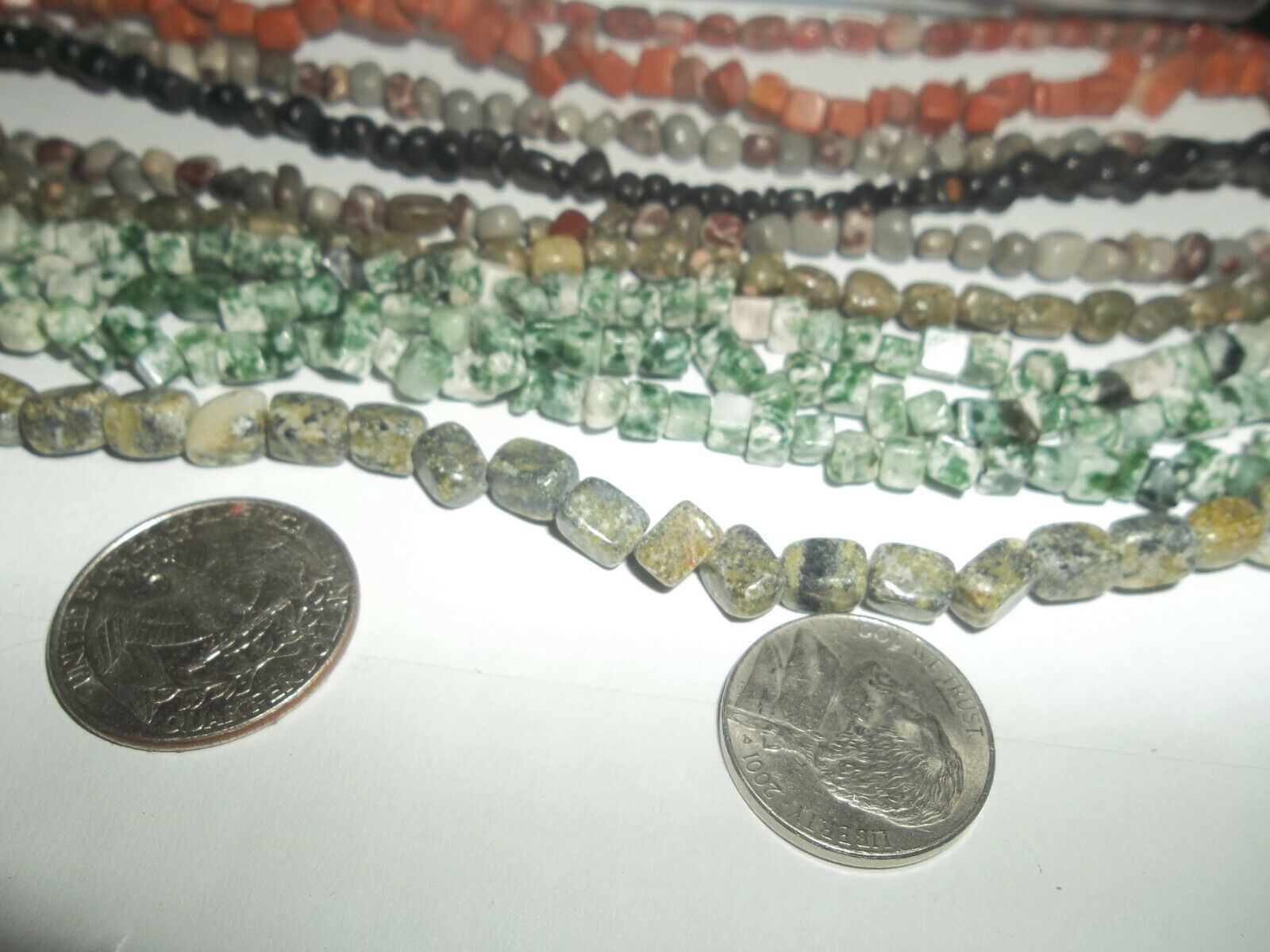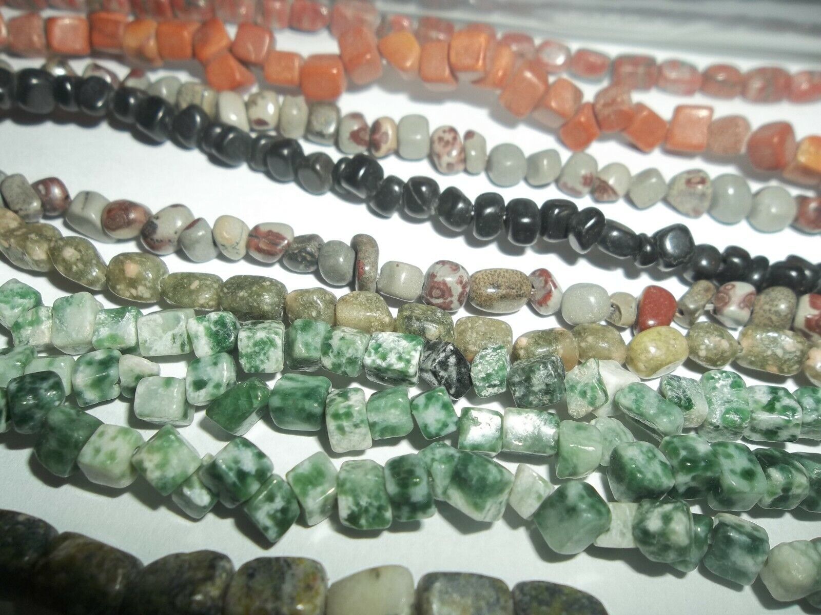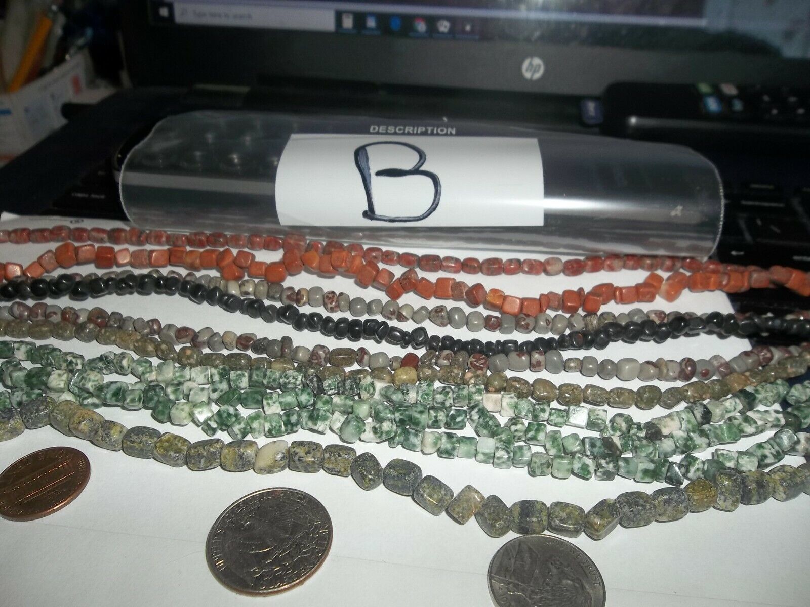 10 strand lot of hand cut assorted shape style and kind. Because they are hand cut there is variance in size and shape. Not much but some. Strands are approx 13 inches long. Look at the coins in the pictures for size reference. These are easy to work with.