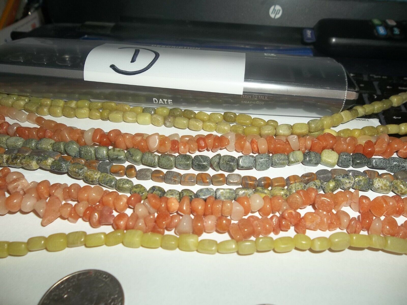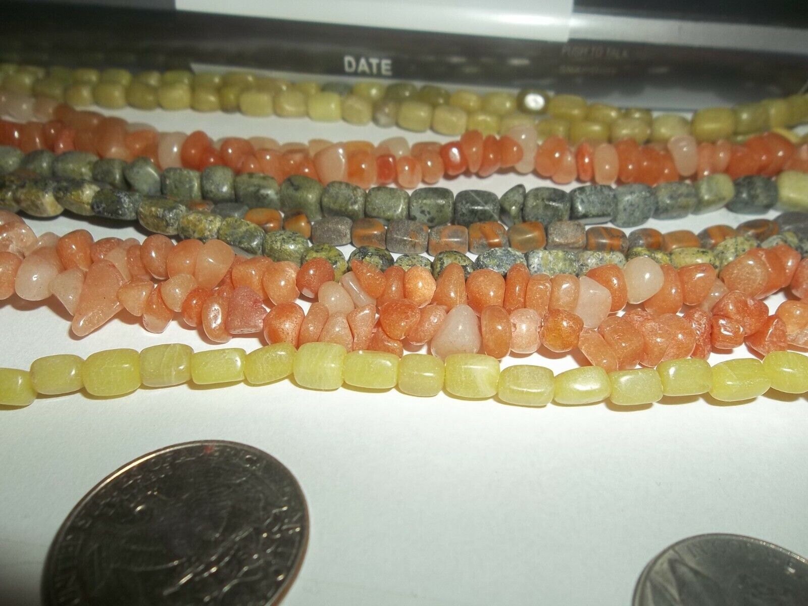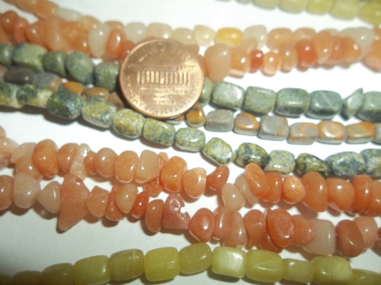 10 strand lot of hand cut assorted shape style and kind. Because they are hand cut there is variance in size and shape. Not much but some. Strands are approx 13 inches long. Look at the coins in the pictures for size reference. These are easy to work with.