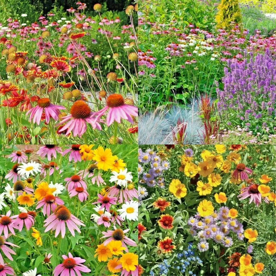 Lupine, Blue Flax, Purple Coneflower, White Yarrow, Columbine, New England Aster, Siberian Wallflower, Lance Leaf Coreopsis, Blanket Flower, Shasta Daisy, Sweet William, Mexican Hat, Black Eyed Susan, Evening Primrose, Dame's Rocket, Prairie Coneflower, Gloriosa Daisy.