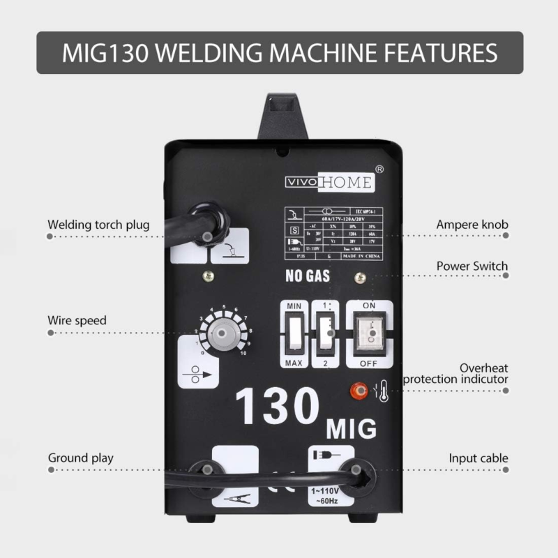 ACCESSORIES INCLUDED ? The VIVOHOME MIG Welder package includes all the accessories you need to weld like a pro: 1x 6.6' welding gun with on/off safety control; 1x 4.9' grounding clamp; 1x welding helmet; 1x wire welding brush; 1 x 0.03" (0.8mm) Flux core wire; and several other small accessories