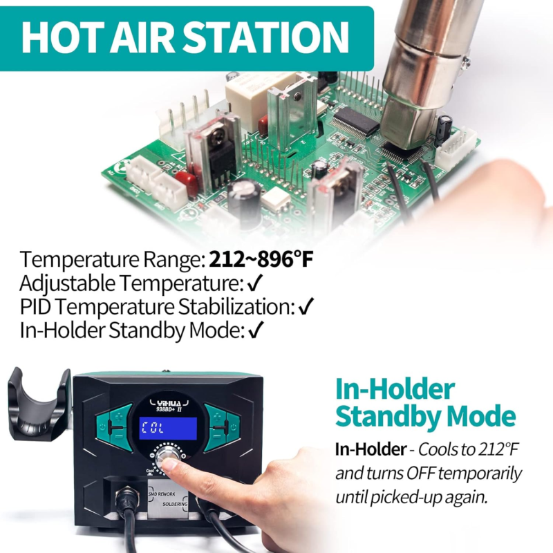 Hot air rework station's temperature is adjustable from 212~896F, adjustable air volume (120L/min Max.), with precision PID program stabilizing the actual temperature every 20ms. The hot air gun comes with stop/start function that activates when placed inside the holder, extending the heating element's lifespan when non-use.