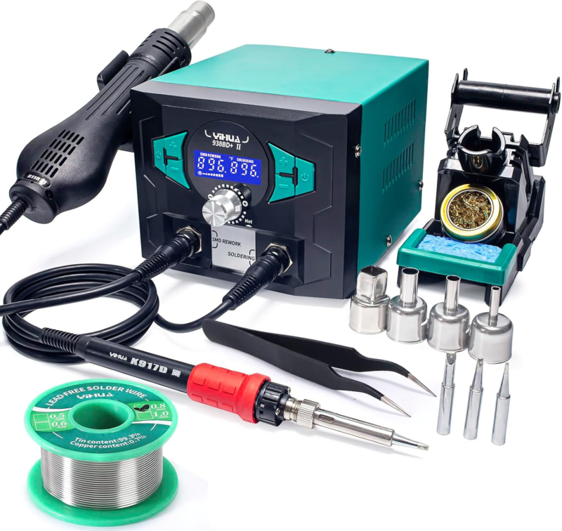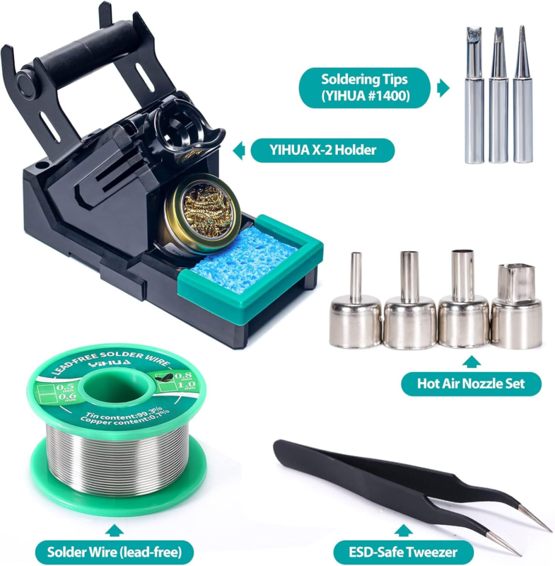 The YIHUA 938BD+ II 2-IN-1 Soldering and Hot Air Station includes: