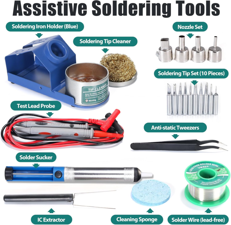 1 x IC Extractor, 4 x Hot Air Nozzles, 1 x Desoldering Pump (golden), 1 x ESD-Safe Tweezers, 10 x Assorted Iron Tips
