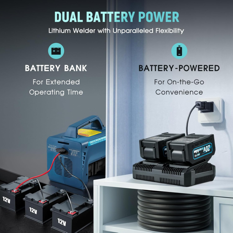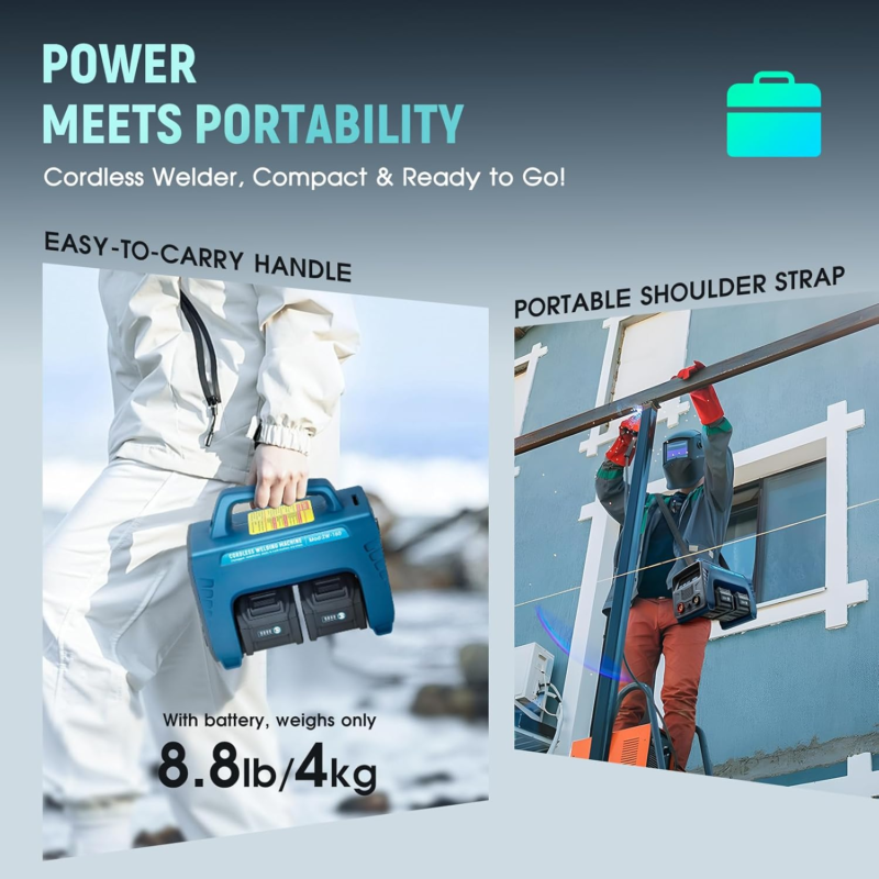 Revolutionary Portability Freedom: Say goodbye to power outlets and hello to endless possibilities. From elevated work areas to outdoors, our compact, lightweight welder adapts to any terrain, empowering you to weld where others can't. Experience the ultimate in portability and performance, with dual batteries that keep you welding non-stop.