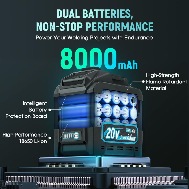Dual Battery Power for Unmatched Flexibility: Introducing dual battery power with a game-changing twist. Power your welding projects with endurance, leveraging either our high-capacity 8000mAh 18650 Li-Ion batteries or hook up to a compatible battery bank for extended runtime. Freely switch from convenience to extended runtime, welding without limits. And to enhance the machine's runtime, we've added 2 extra batteries, bringing the total to 4, for longer and uninterrupted use.