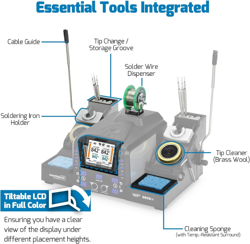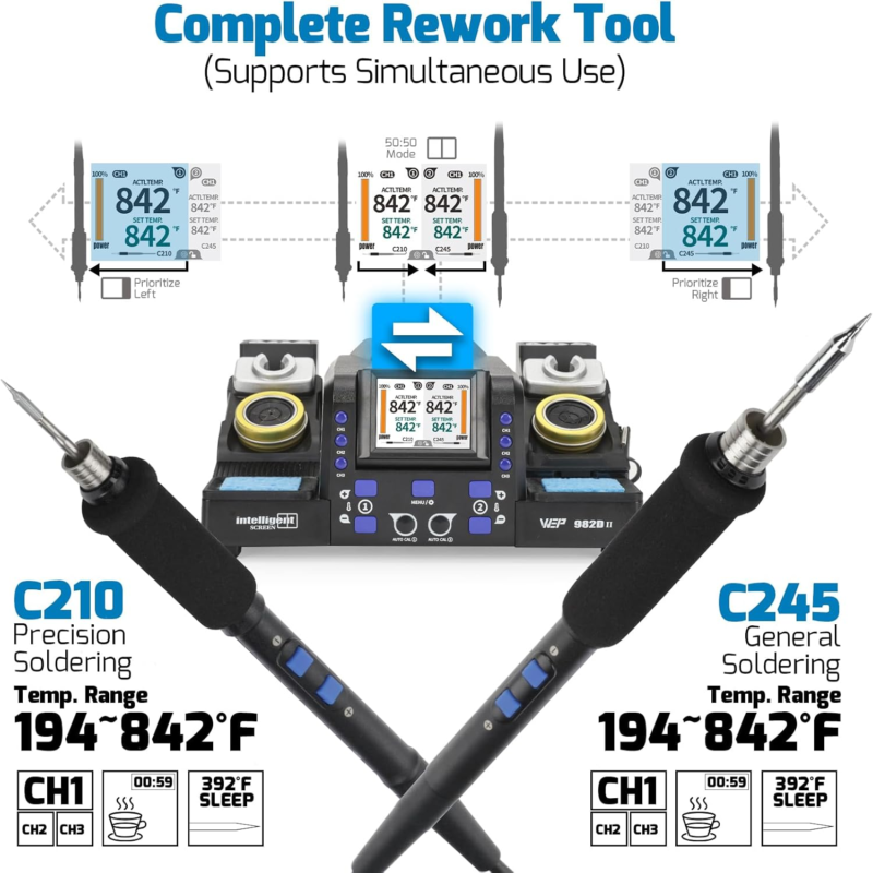 WEP 982D-II 2-in-1 precision soldering station allows simultaneous use of the Type-210 and Type-245 tips for enhanced versatility and precision in micro soldering tasks