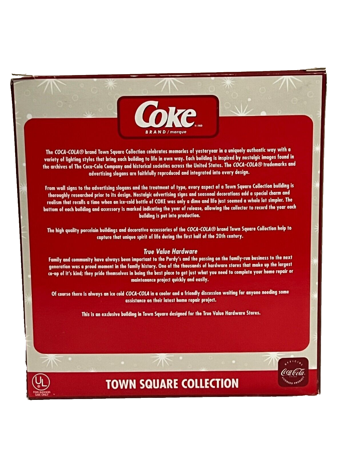 This Coca-Cola Christmas village building from the Town Square collection is a must-have for collectors and holiday enthusiasts alike. The square shape and intricate design make it a beautiful addition to any display. This particular building is modeled after the True Value Hardware store, adding a touch of nostalgia to your holiday decor.