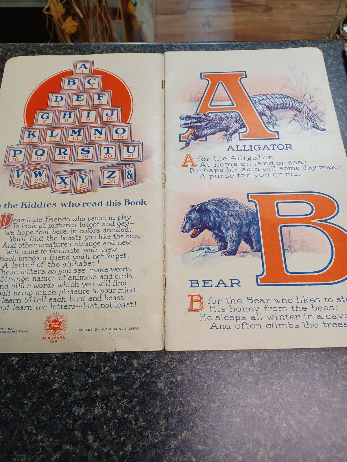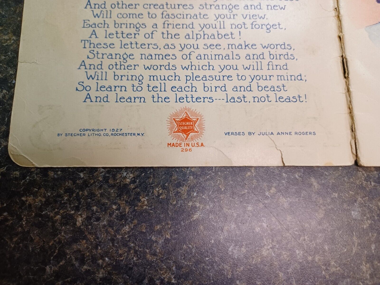1927 ABC Book of Animals Stecher Litho No 51 Verses Julia A Rogers Beautiful