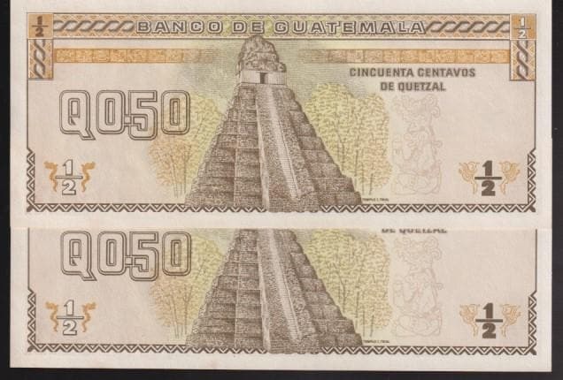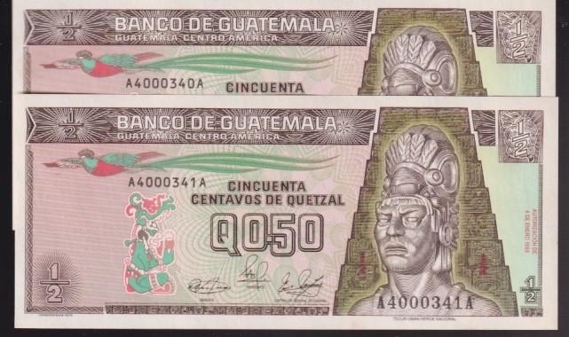1972-1983 Guatemala "Tecum Uman" Nat. Hero 1/2 Quetzal x 2 Consecutive Crisp UNC